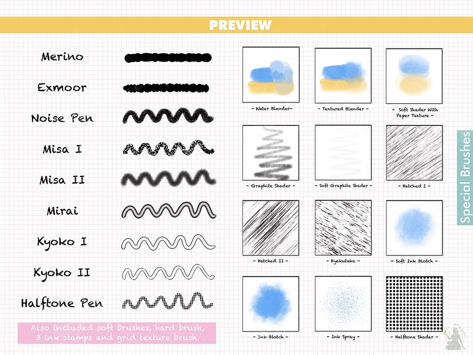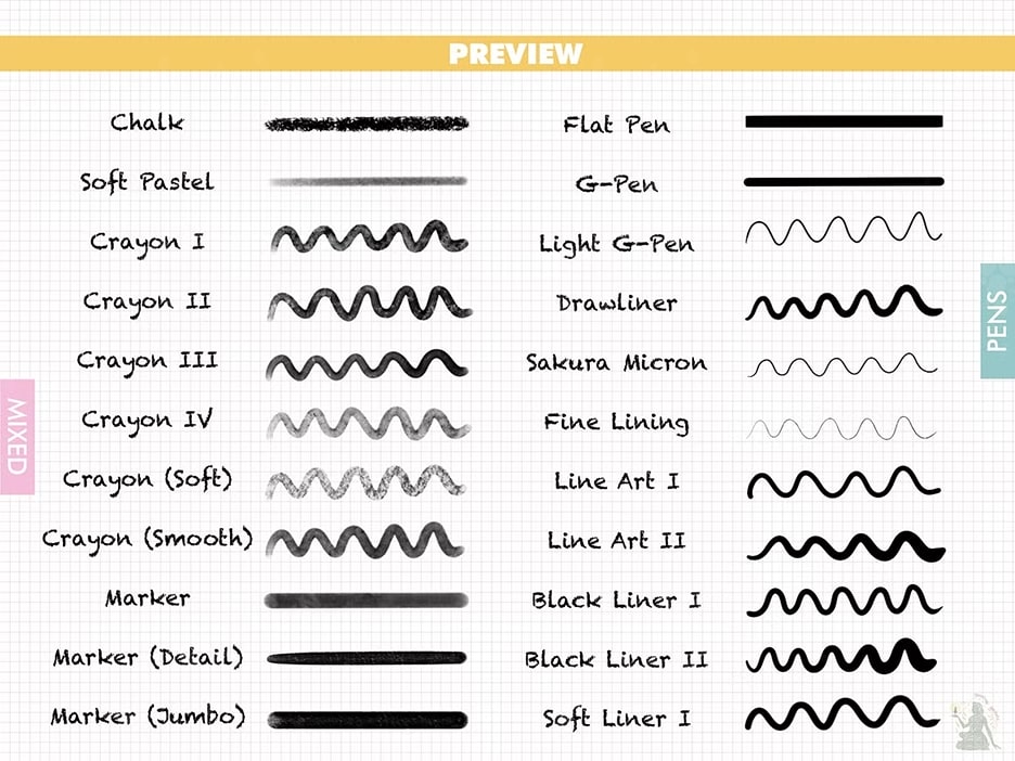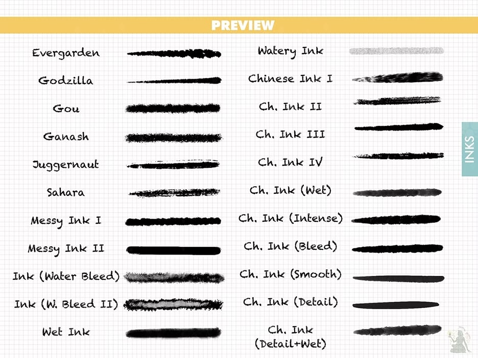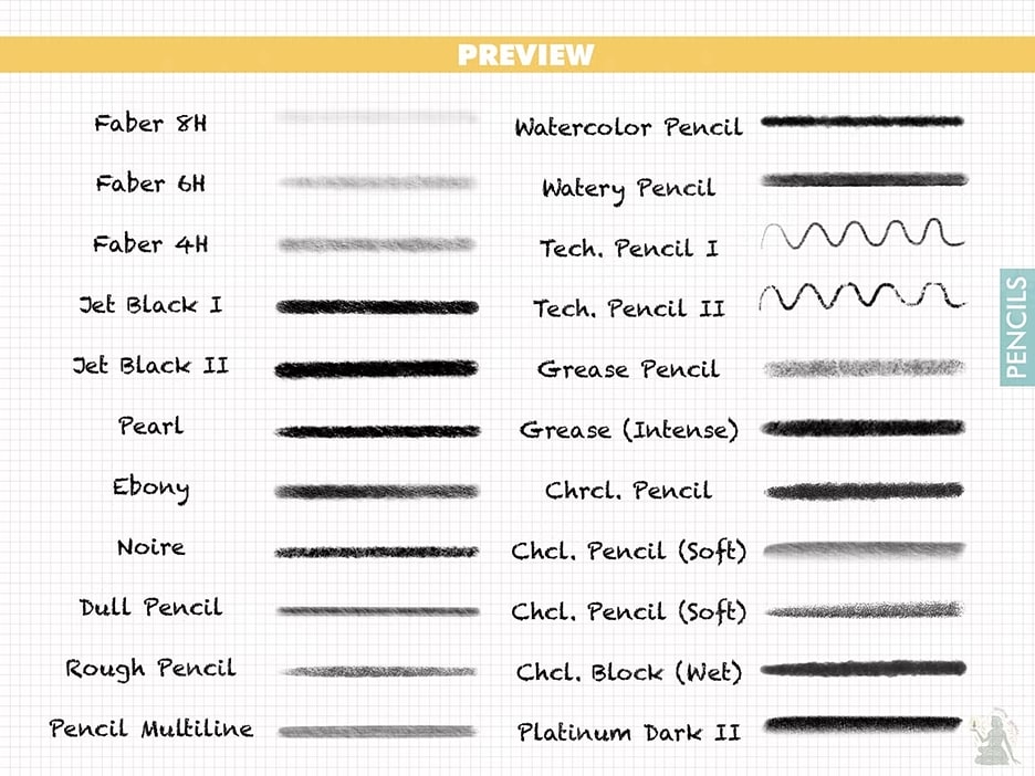 无论您是在寻找出色的素描笔刷、纹理笔刷、阴影笔刷还是高光笔刷,此笔刷套装都拥有丰富的选择。有多种笔刷可供选择,包括铅笔、钢笔、粉笔、炭笔、墨水笔、特殊墨水笔、阴影笔、高光笔、中国墨水笔和线条笔,您一定能找到适合您下一个项目的完美笔刷。