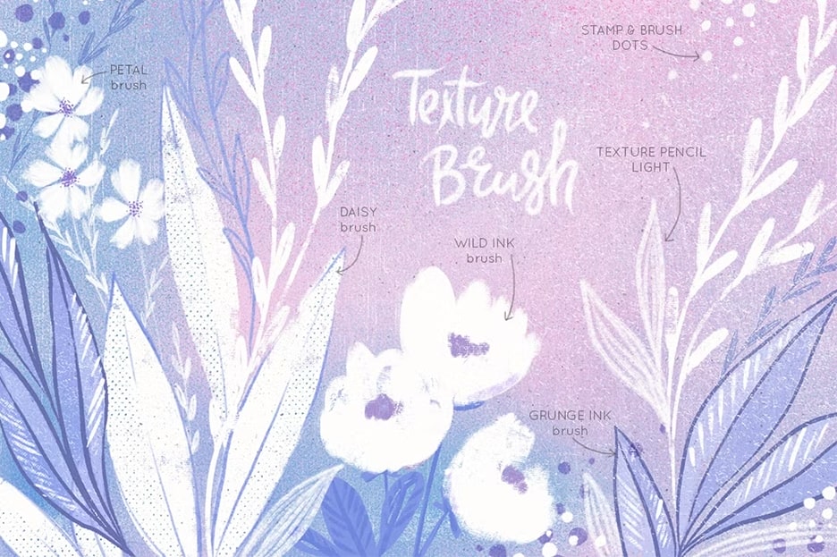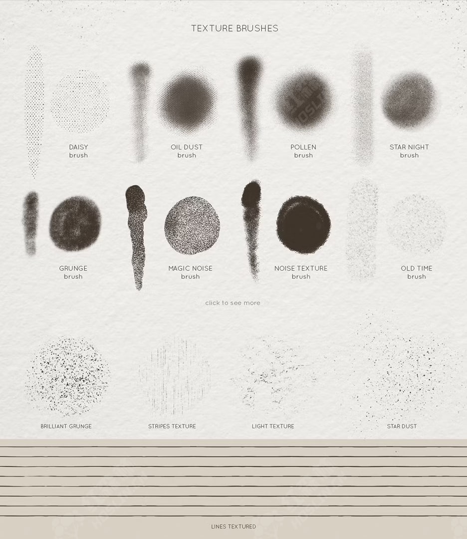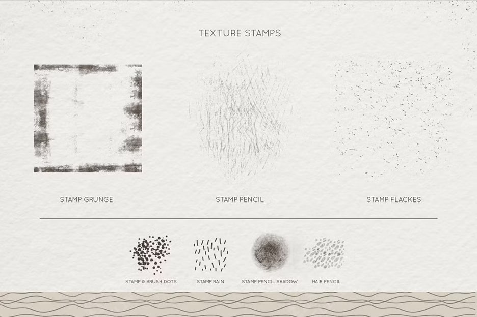 30 款适用于 Procreate 的纹理画笔和图章合集。该套装包括一支铅笔、纹理和图章。适用于素描和全彩插图。