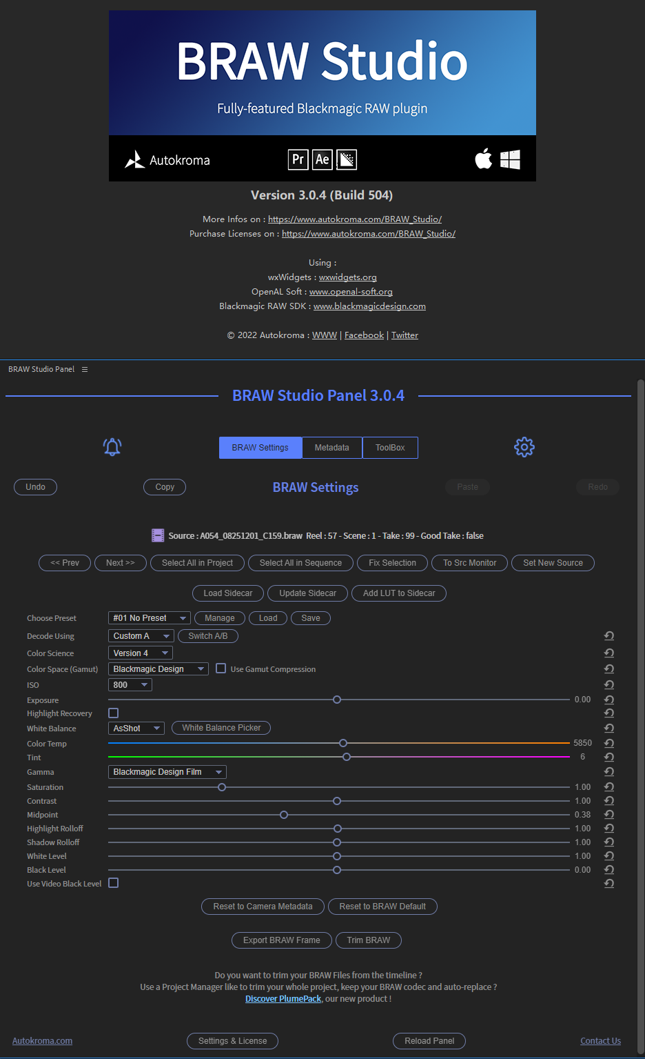 BRAW Studio是一款适用于Adobe Premiere Pro和Media Encoder的全新Blackmagic RAW(.BRAW)素材导入器!使用这个插件可以将Blackmagic RAW(.braw格式)的素材直接导入到After Effects, Premiere Pro 和 Media Encoder软件中,还可以进行一些参数的设置。