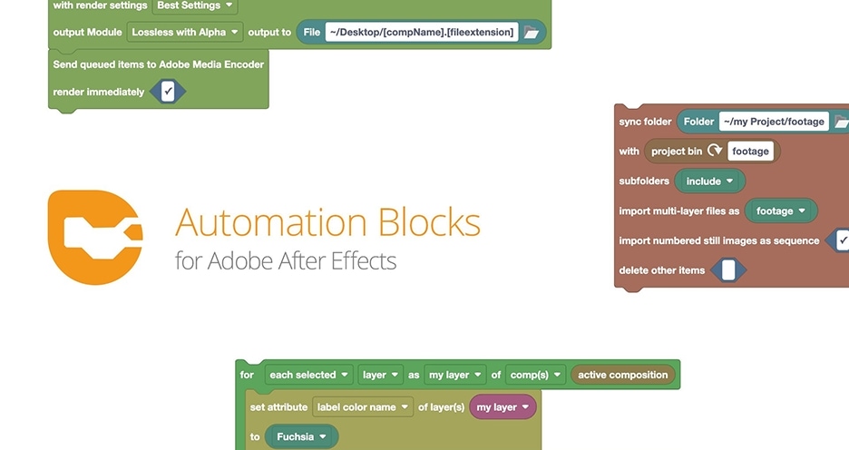 Automation Blocks 拥有大量的一键处理工具库,如:电子表格中的重复项、调色板工作流程、合成时间工具、表达式、指南、关键帧管理、项目清理、生成预设、强化预合成、文本来自/到电子表格、同步文件夹等等!