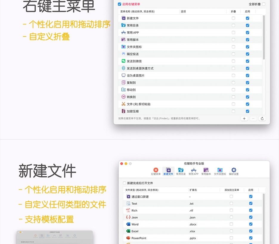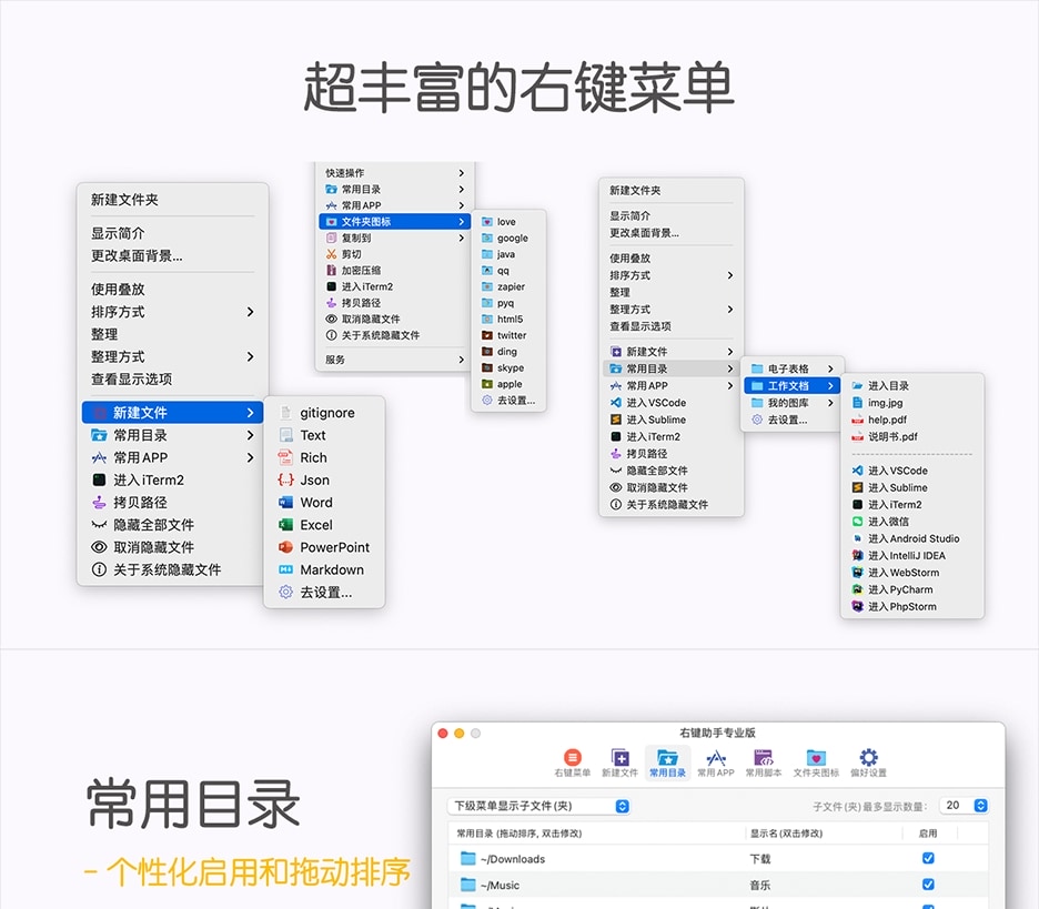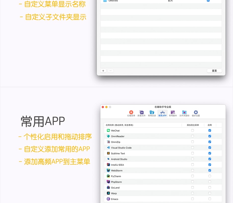 另外,右键助手的自定义功能非常强大,您可以根据您的喜好,对右键菜单自行排列,禁用您不常用的菜单,您还可以把常用的APP和经常需要创建的文件类型添加到主菜单中,提高工作效率!如果您对菜单栏的默认命名不满意的话,您也可以自定义修改!