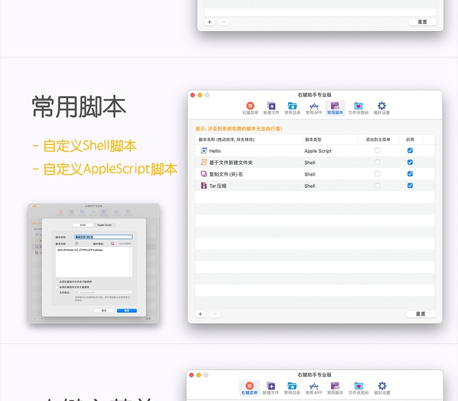 - 常用脚本:这绝对是开发人员的福音,支持 Shell 和 AppleScript 脚本,您可以把您常用的脚本添加到进来,自定义右键菜单功能,让您的工作效率大幅度提升,应用默认还内置了几个示例脚本供大家学习使用:基于文件新建文件夹,复制文件(夹)名,Tar文件压缩。