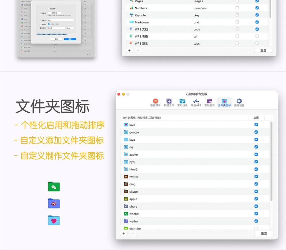 - 文件夹图标:如果您想要对某些文件夹进行特殊标识,或者您对系统文件夹图标看厌了的话,那么您完全可以给它们换一种您喜欢的显示风格。右键助手内置了 20 多种图标风格,如果不合您胃口的话,您完全可以自定义设置!