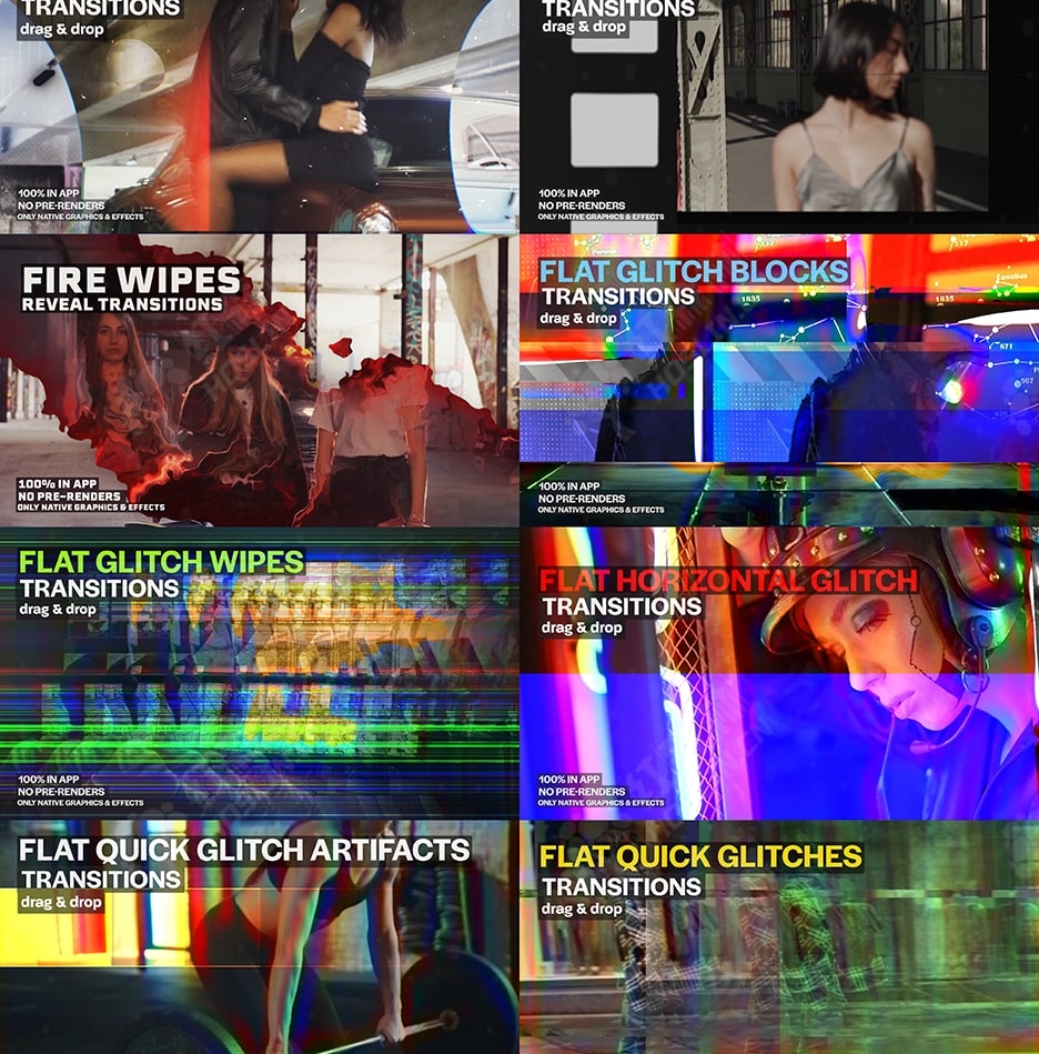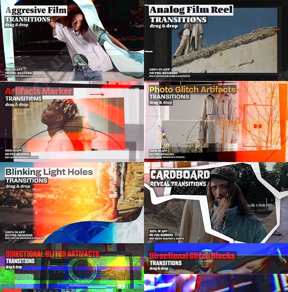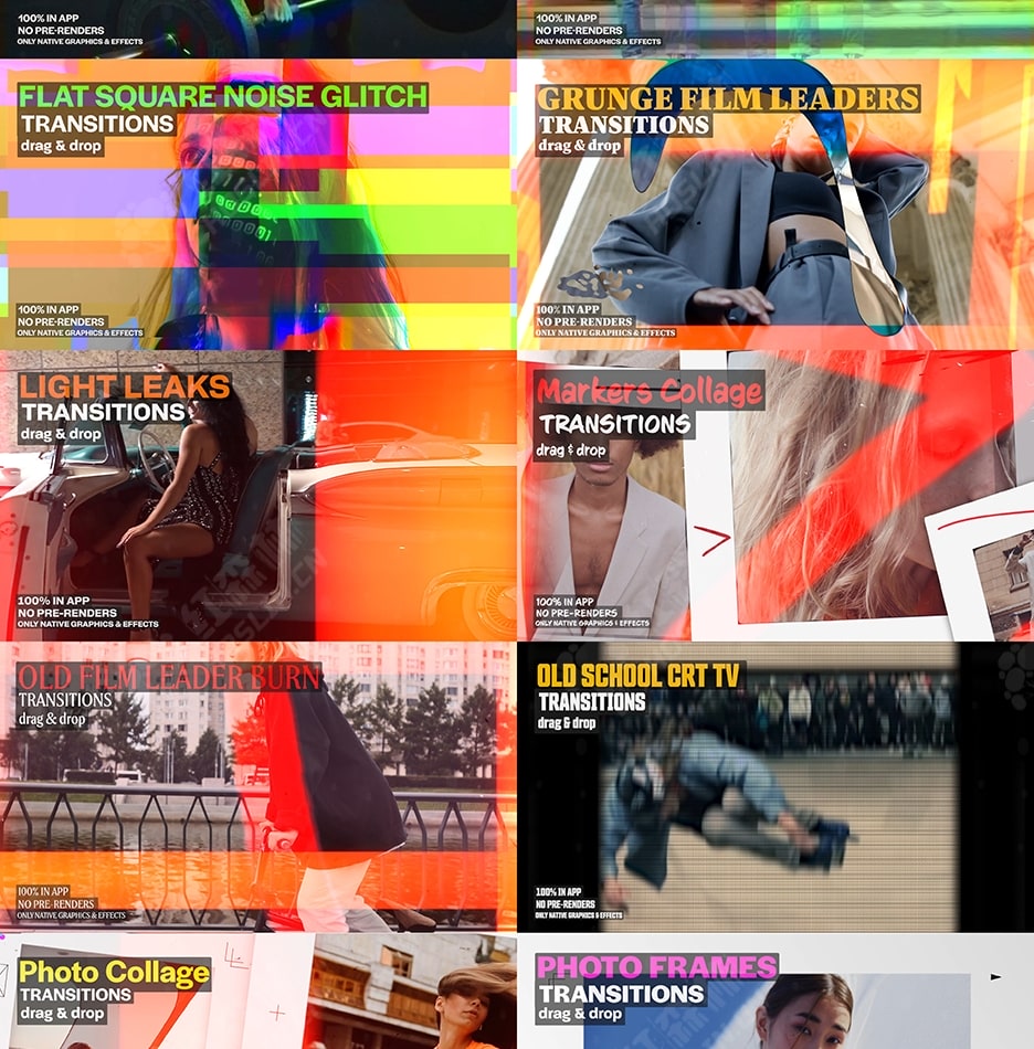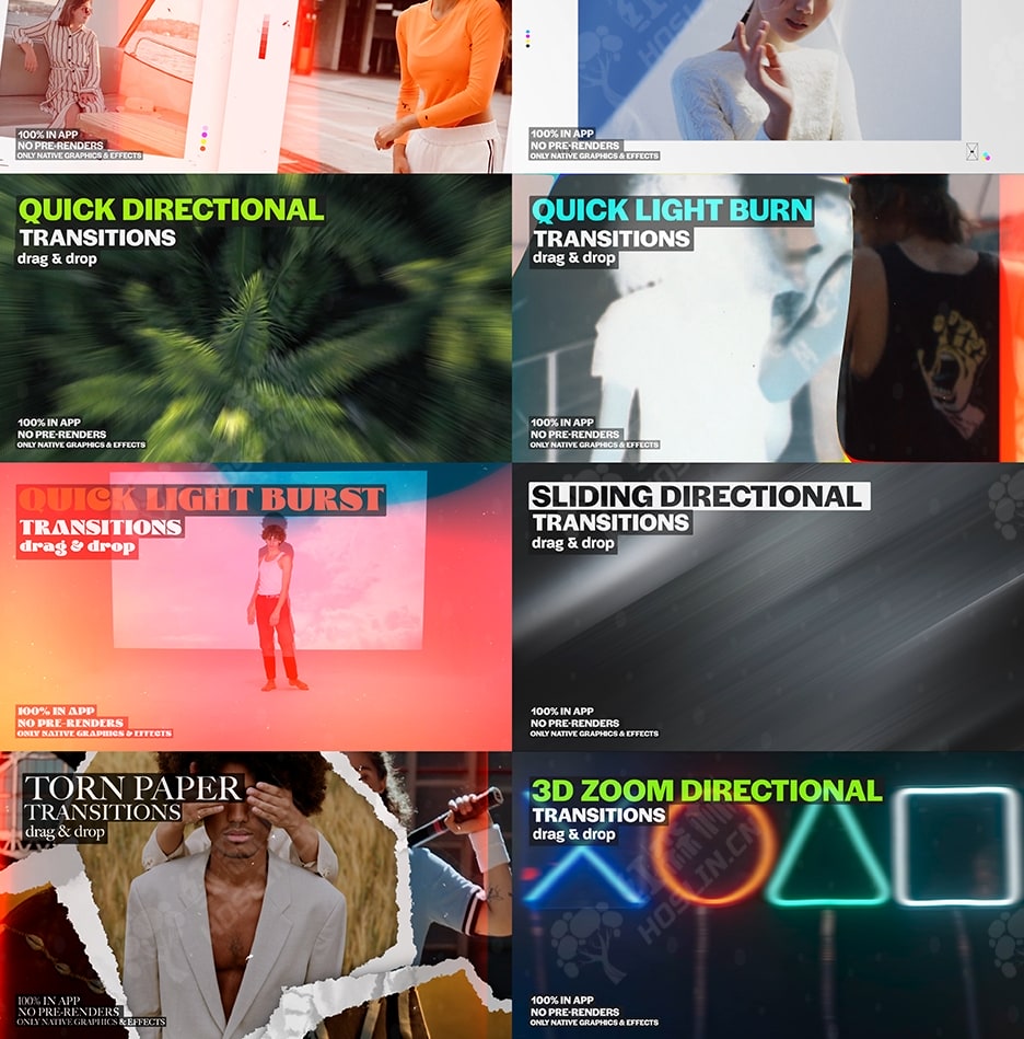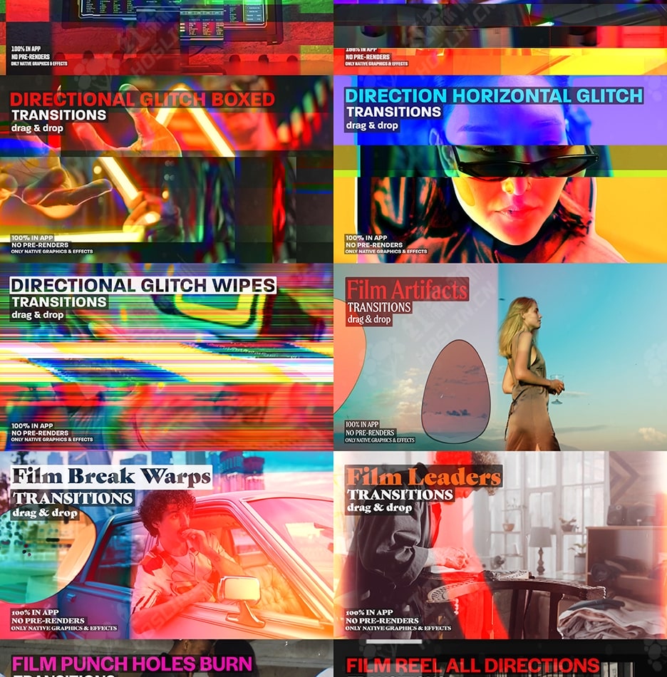 此过渡包与其他任何过渡包都不同。使用原生效果可确保项目规模更小、渲染速度更快、稳定性更高、依赖管理更少且质量始终如一。创新的原创风格打破了平凡,独特的设计与众不同,可提升您的项目。具有超越常规的独特元素,结合大胆、富有创意的触感,打破常规,让您的作品与众不同。