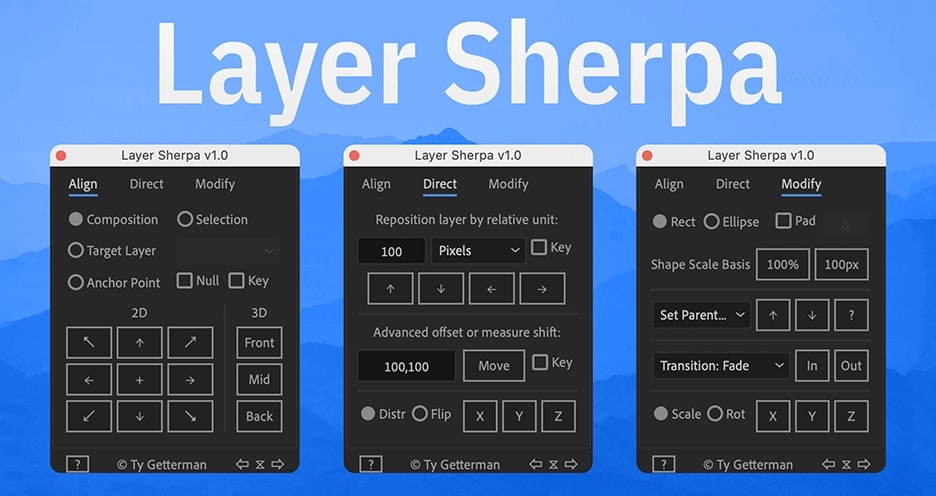 Layer Sherpa 是 Adobe 有缺陷的对齐面板(以及更多功能)的替代品,它采用热键增强的选项卡式用户界面。Layer Sherpa 是一个 After Effects 脚本,可帮助运动设计师通过热键增强的极简选项卡式界面摆脱繁琐工作、提高效率并提高准确性。