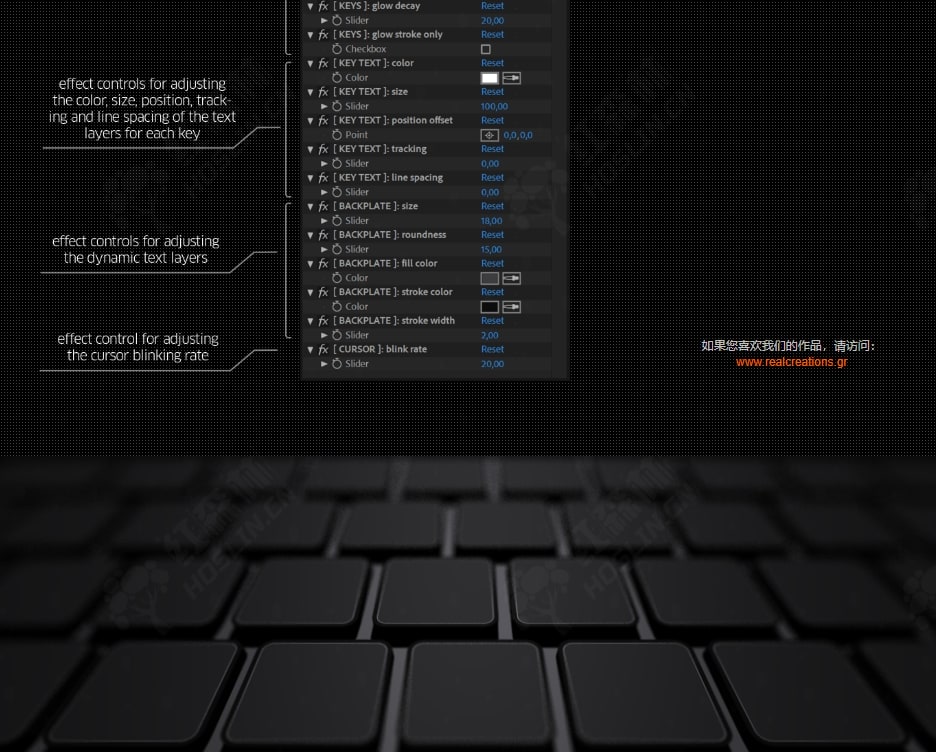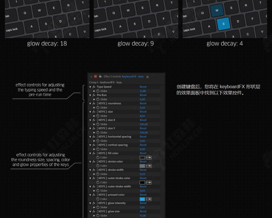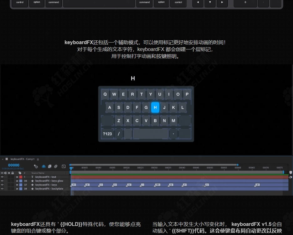 keyboardFX是一款 Adobe After Effects 使用的工具,可以用于显示实体键盘界面输入打字动画,可用来创建任何类型键盘的用户打字动画,可以点亮键盘上的所有按键,多种功能控制。如果您想创建一个动画打字键盘,它为您节省了大量的设计时间,这就是您的工具!新功能:移动键盘的智能大小写检测和新的虚拟键盘面板 + 更多!