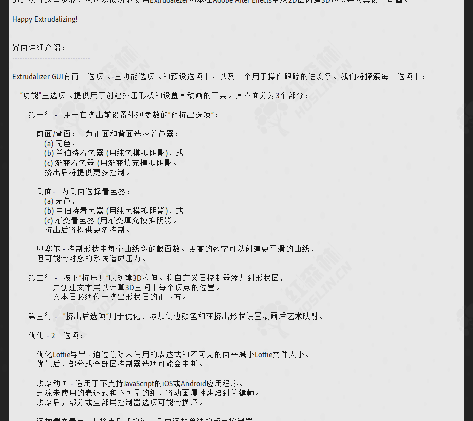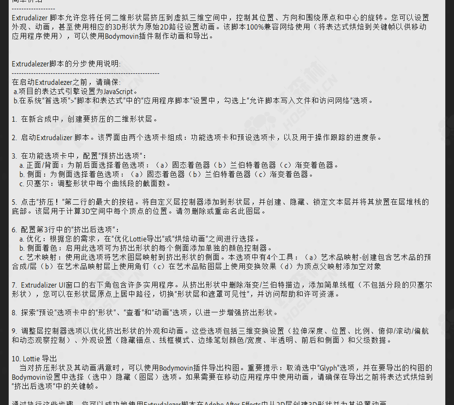 Extrudalizer 允许您将任何 2D 形状层挤压到虚拟 3D 空间中,控制其深度、位置、旋转和比例。您可以设置外观、动画,甚至可以使用重复此操作的 Extrudalized 形状来操作原始 2D 路径。该脚本 100% 兼容 Lottie 以供网络使用(将表达式烘焙到关键帧以供移动应用使用),并且可以使用 Bodymovin 插件导出。Extrudalizer 的创新方法让用户可以继续使用他们熟悉和喜爱的 2D 形状图层,同时享受增强的 3D 操作带来的好处。与可用于 3D 图层的工具集相比,After Effects 拥有更多第一方工具和效果来操作 2D 图层。Extrudalizer 绕过了这些限制,计算所需的 3D 变换并使用 Adobe Javascript Expression Engine 在 2D 路径属性内绘制它们。