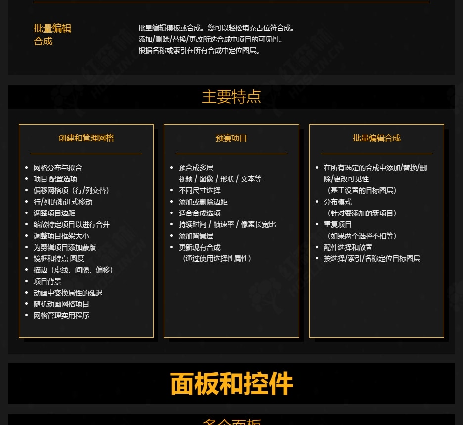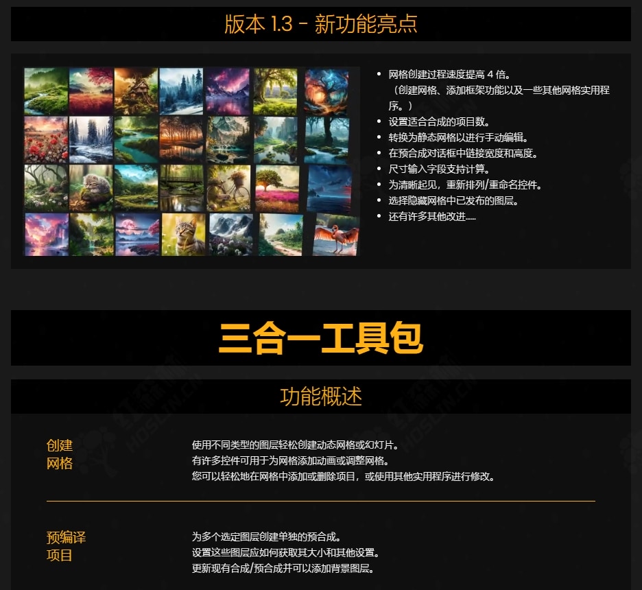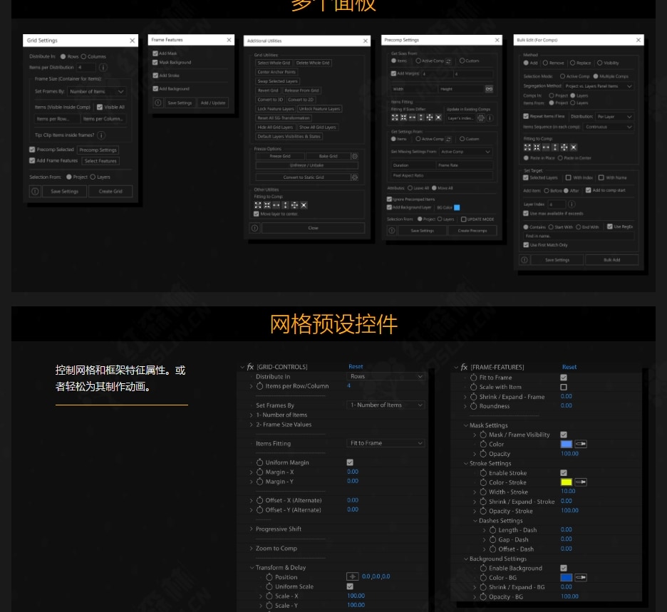 使用脚本 Slides & Grids轻松创建动态网格和幻灯片动画,具有很大的灵活性。它还提供3 个强大的工具,用于创建和管理网格、创建或更新预合成以及批量编辑项目或模板的合成。