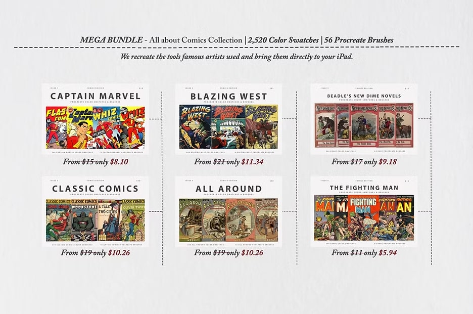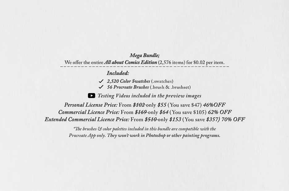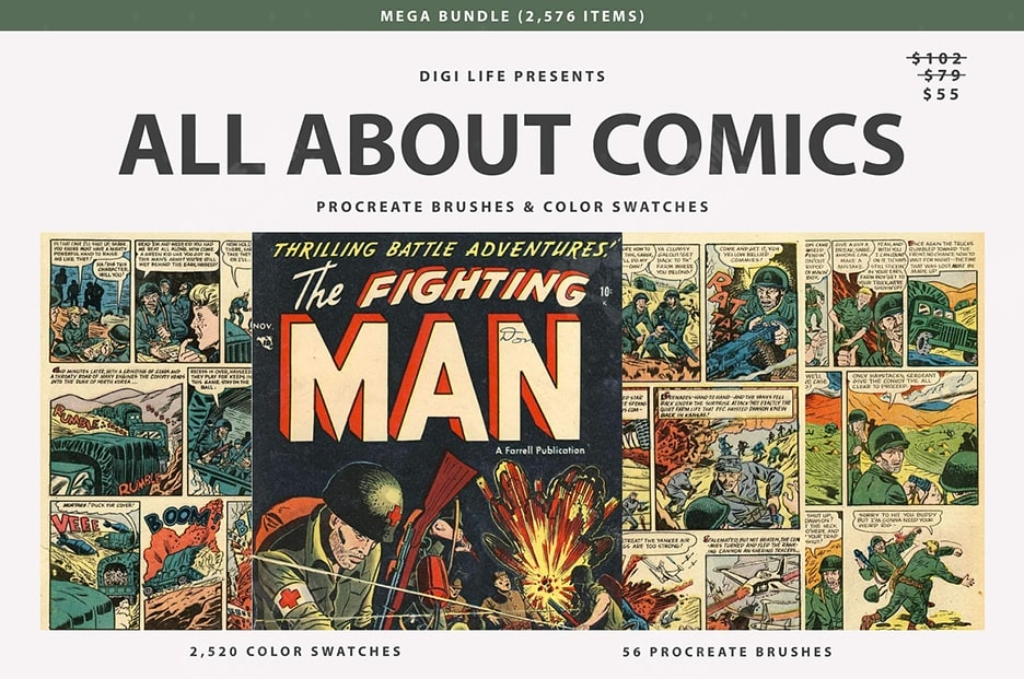 - 56 个 Comic Procreate 画笔(还包含 .brushset 文件,可让您一次安装所有画笔集。)