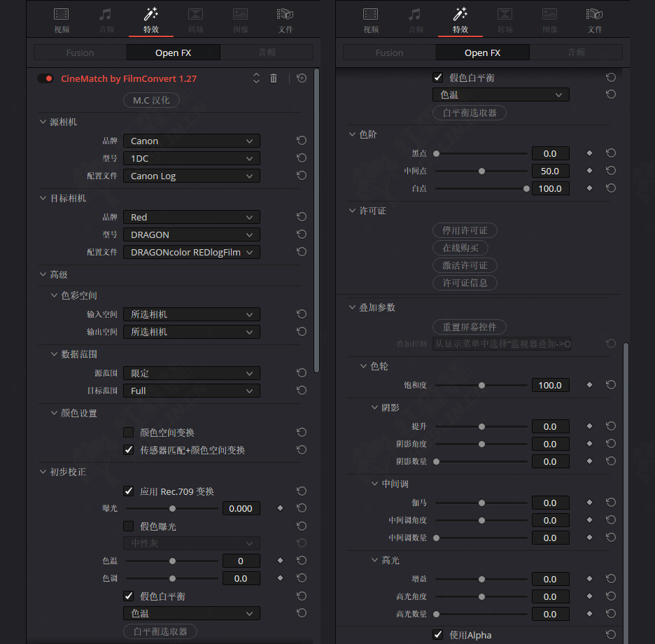 - 传感器匹配:使用专用的相机包,CineMatch可以将您的素材从一种Log图片样式转换为另一种。在SLog2 / 3,CLog,BRaw,V-Log / L,RED IPP2等之间进行混合和匹配,然后单击一下即可应用正确的REC.709转换。
