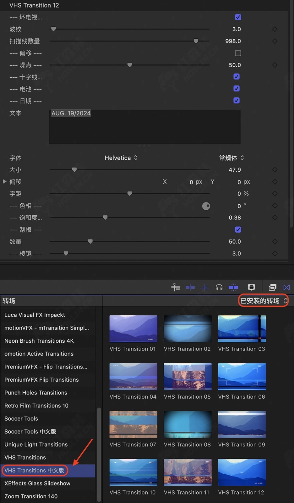 Final Cut Pro 的 VHS Film Transitions 拥有您创建时尚、吸引人的视频、开场片、简介、音乐视频、YouTube 视频、预告片、预告片、徽标展示等所需的一切。效果组织良好,使用起来非常简单。