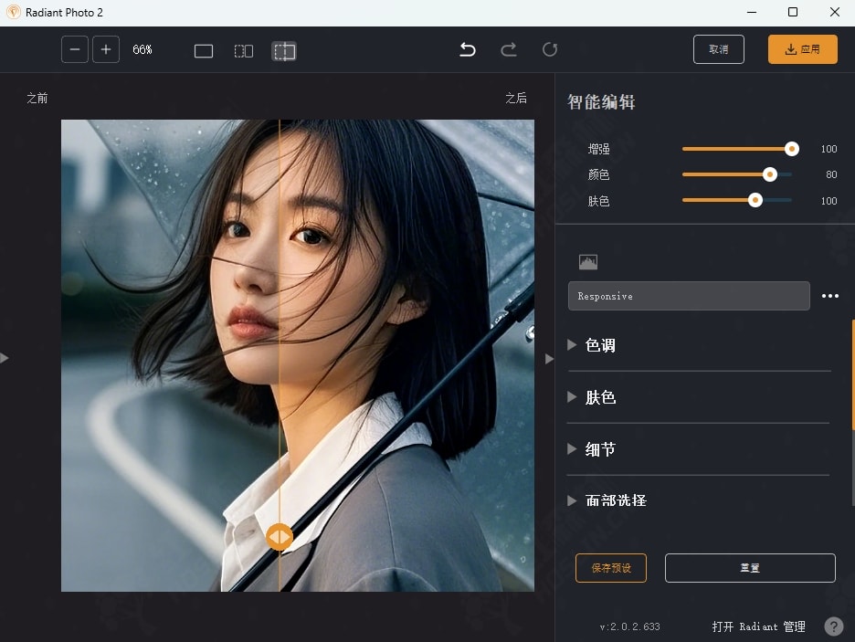 - 人像工具:通过增强眼睛、皮肤等的自然编辑来增强主体的美感。