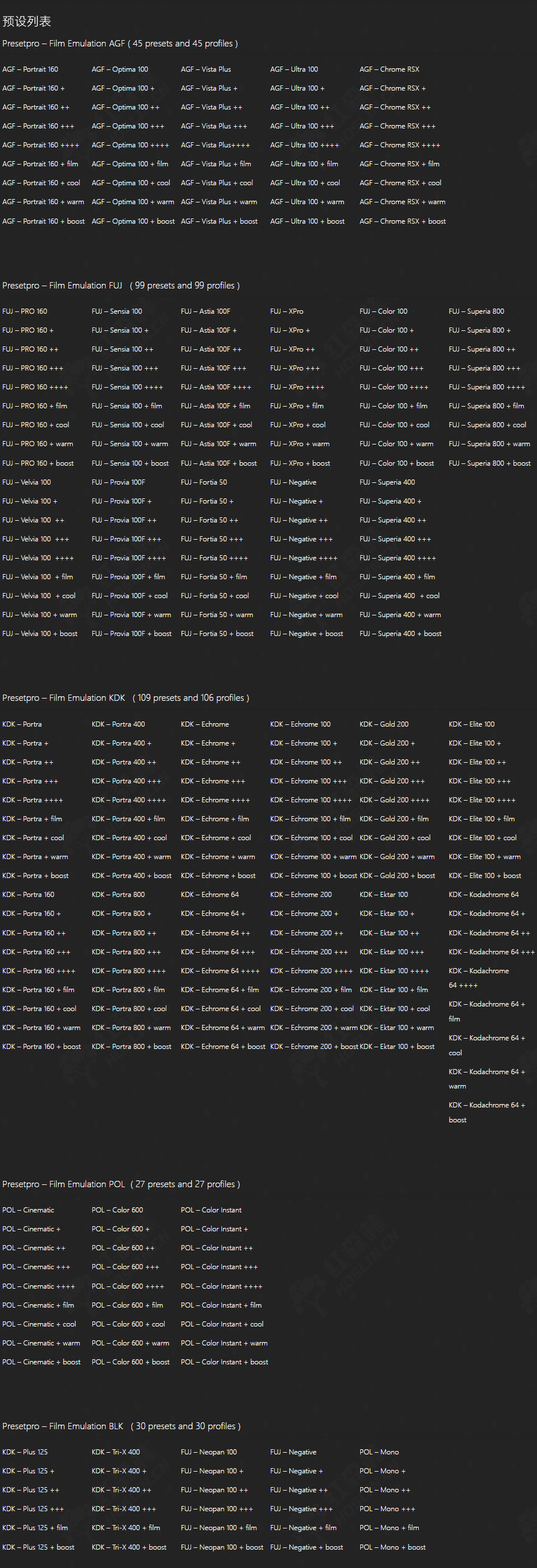 - Presetpro 胶片模拟系列包括300 个胶片预设和 300 个配置文件。