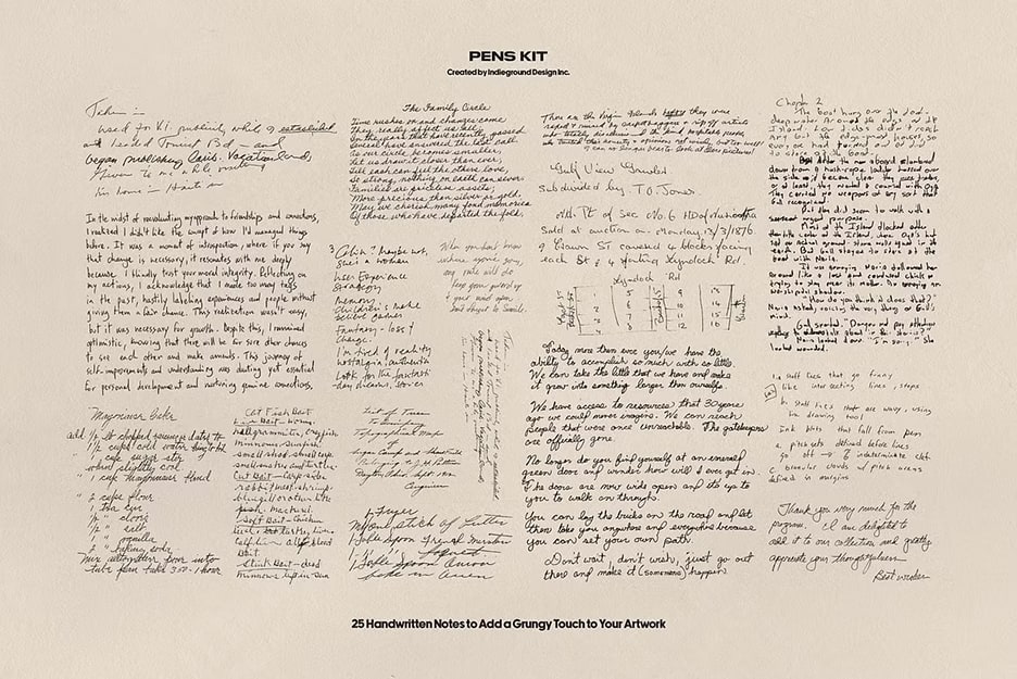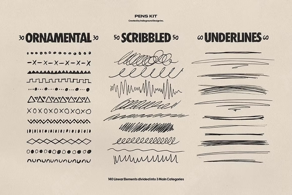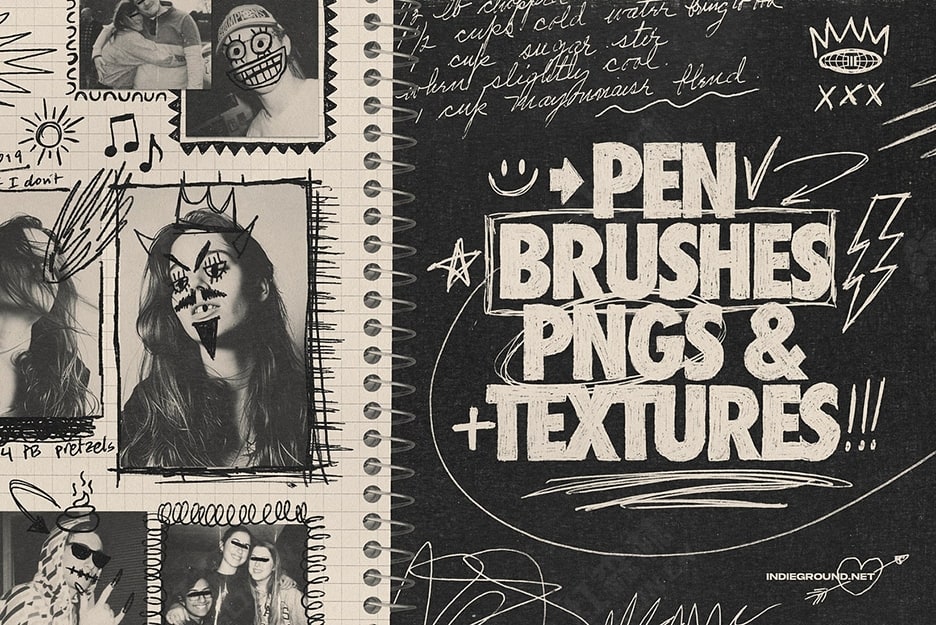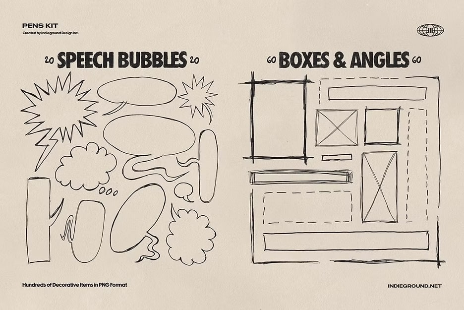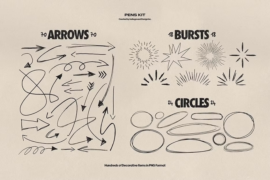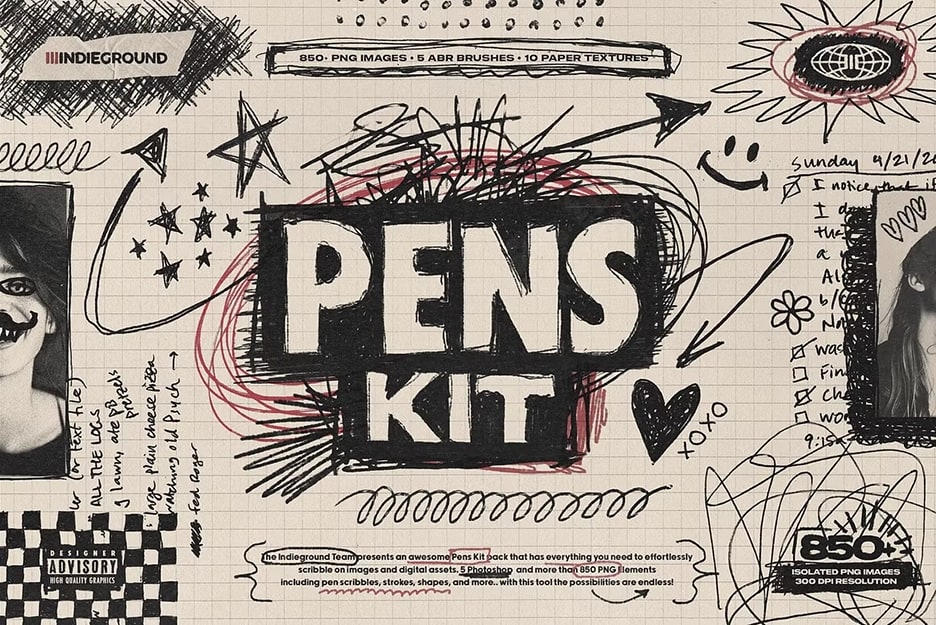 Indieground 的新 Pens Kit 是你能找到的最全面的笔包:850 多种透明 PNG,外加 5 种 Photoshop 画笔。让你的想象力飞翔,这些工具会完成剩下的工作!