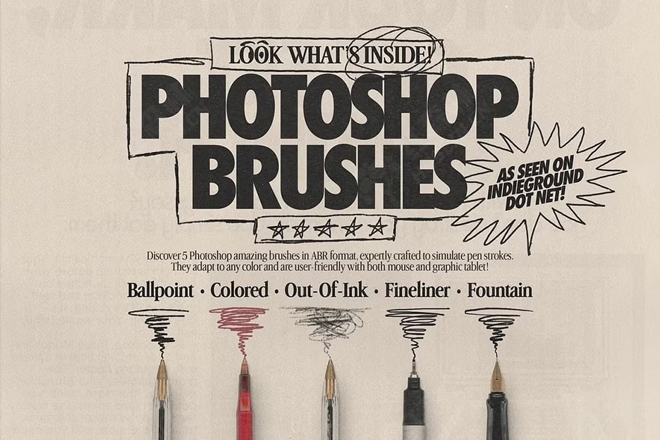 - 5 个适用于 Photoshop 的 .ABR 画笔,包括以下标记笔刷:圆珠笔、彩色笔(红、蓝、绿)、没墨的笔、细线笔、钢笔