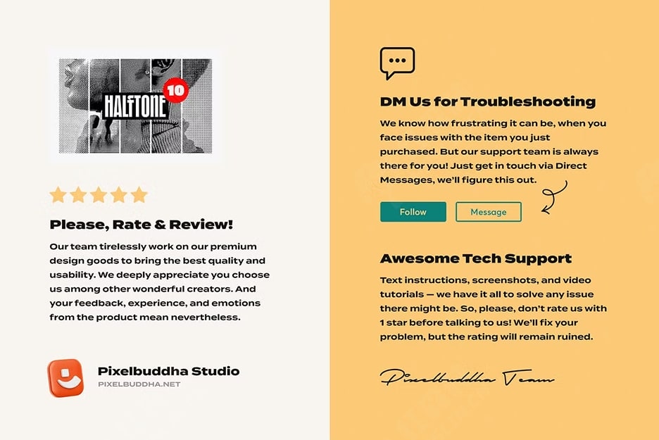 当正在进行的创作过程缺乏一点个性时,是时候尝试一些照片效果了!为了帮助您实现这一点,我们尝试创建一套完整的经典但非常重要的半色调纹理。欢迎使用一套新的污渍工具,在各种图像上进行测试,以便为您提供您可以看到的完美产品!