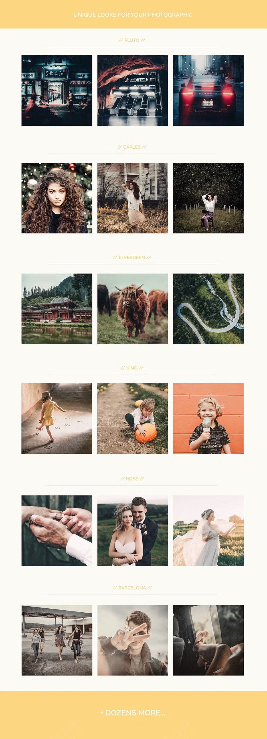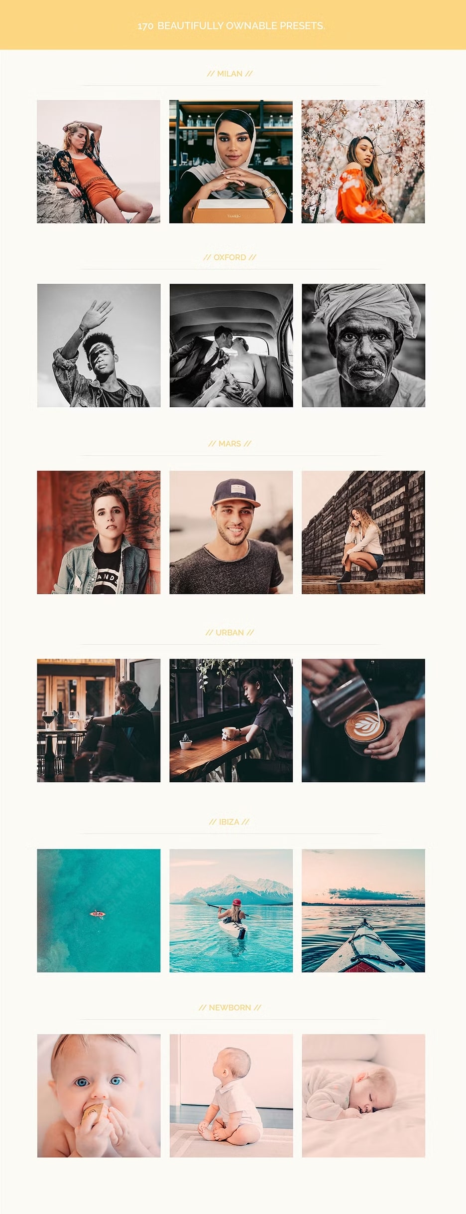 这些预设适用于所有类型的摄影,无论您是为孩子拍摄 Instagram 照片的父亲、高端时尚修图师还是希望增加社交帖子连续性的咖啡店主。该系列包括 170 个预设,这些预设是我多年来用自己的摄影经验磨练出来的,适合各种情况。你可以往下翻看图像查看这些预设应用效果。