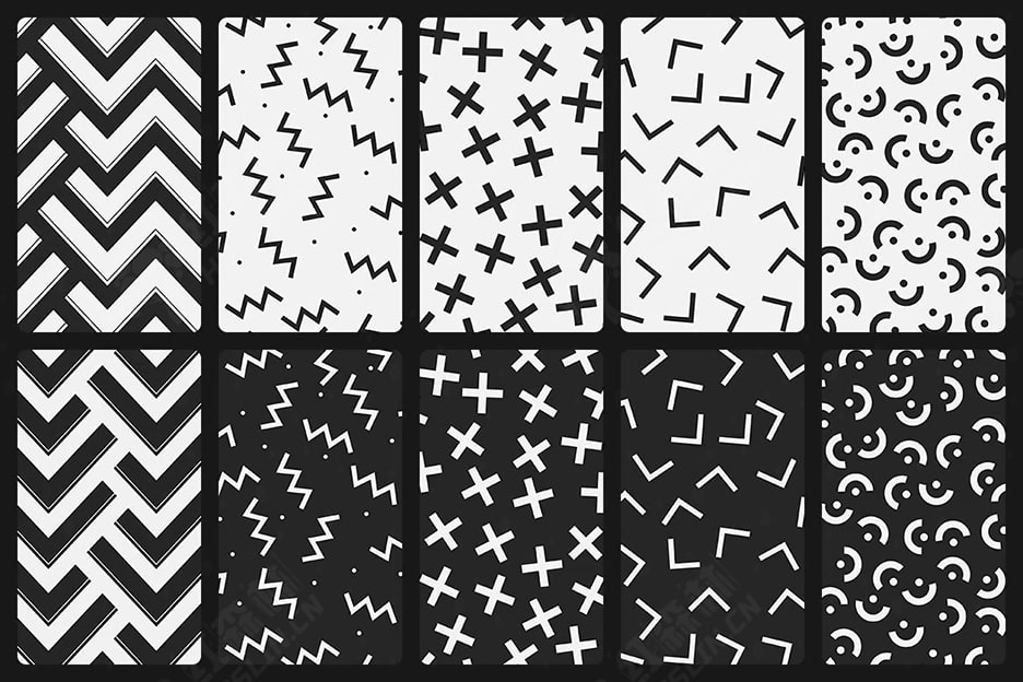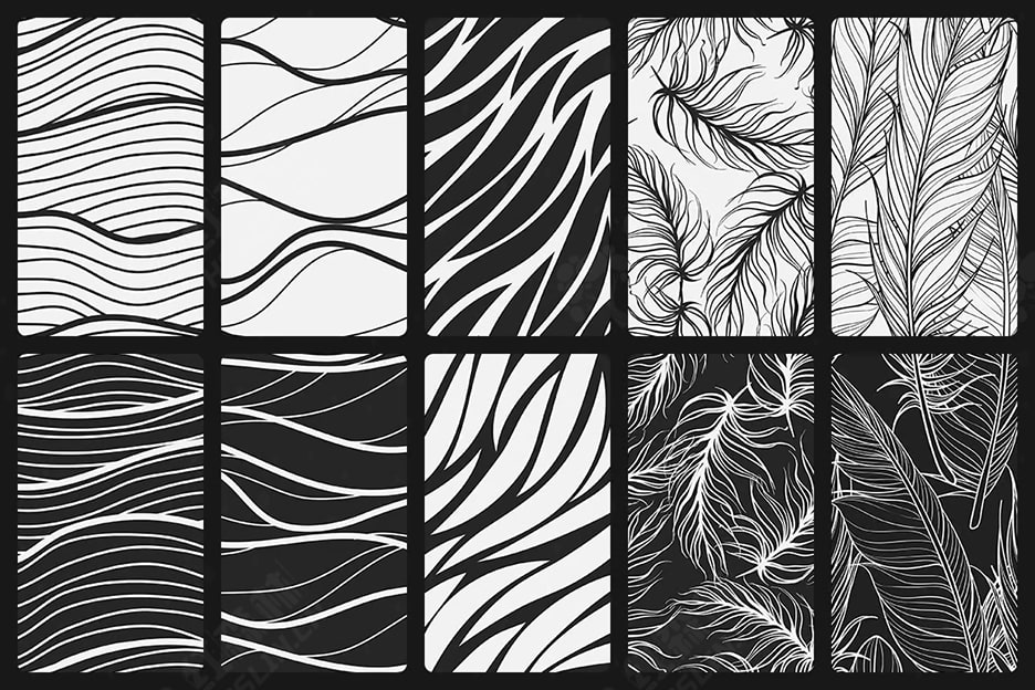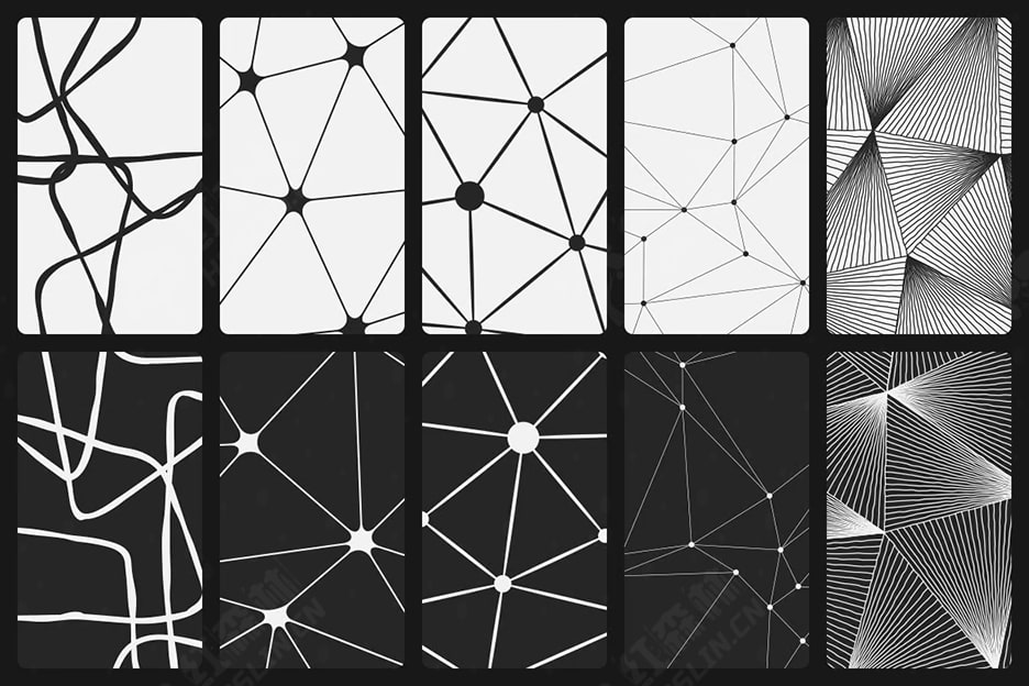 档案包含: 沃洛诺伊图(泰森多边形)网格、几何多边形、带连通点的轮廓多边形、三角格子、锯齿形、不规则锯齿形、十字、角度、几何形状、圆角迷宫、有机圆线、不规则圆线、虚线、地形图、线性海浪、波浪条纹、波浪叶、羽毛、花卉、叶子、圆形箭头、时髦箭头、笔触几何形状无缝图案和可平铺背景。