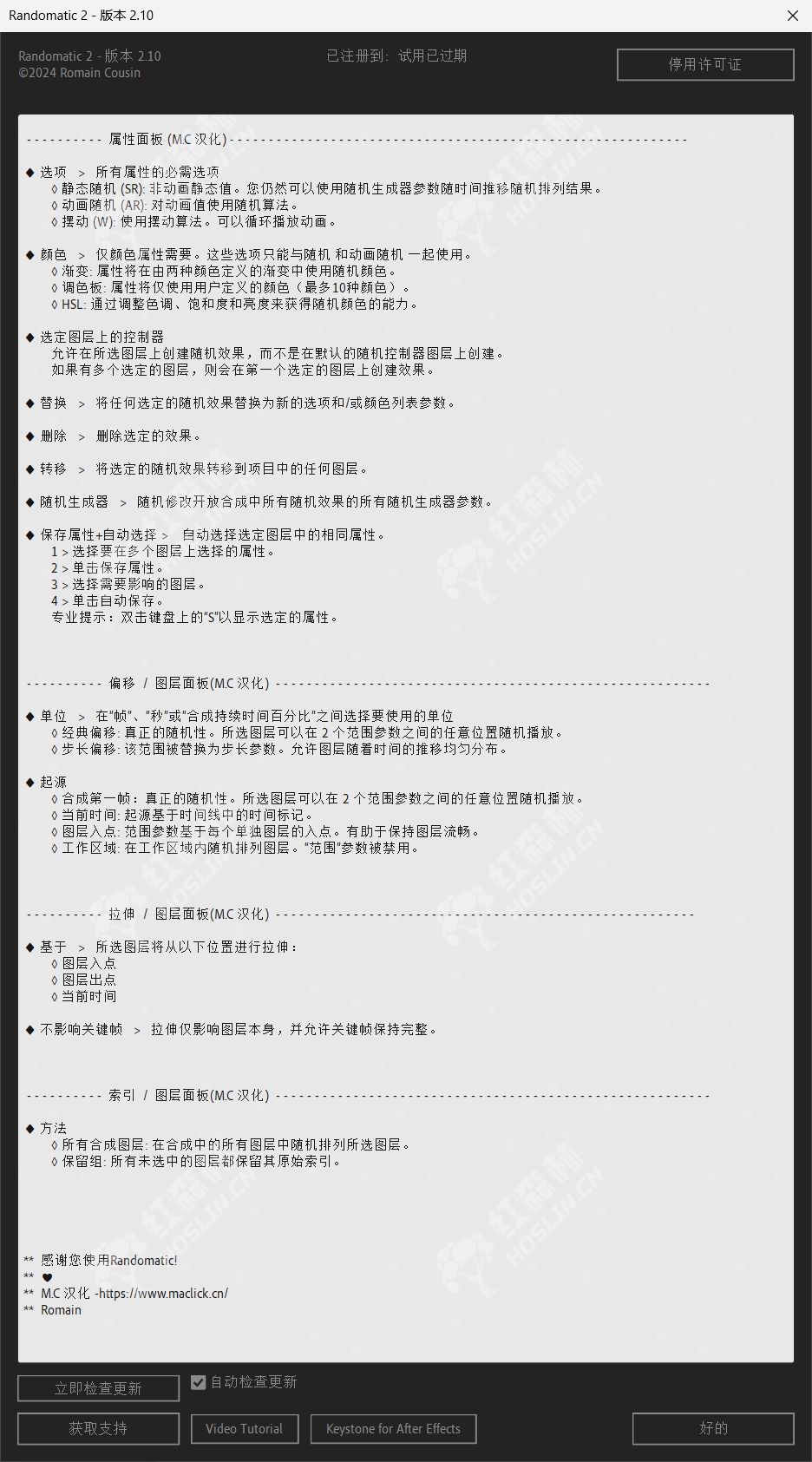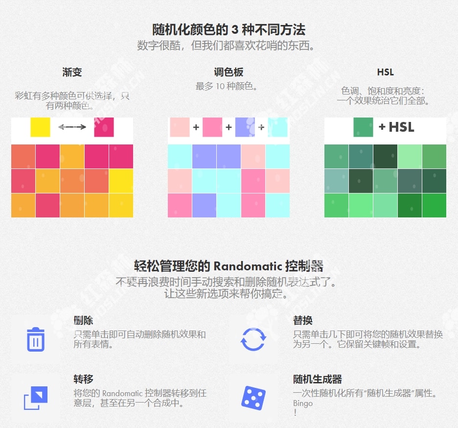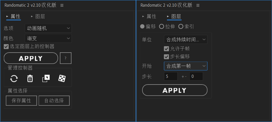 脚本Randomatic 2 是在 After Effects 中创建 2D、3D 和颜色属性随机值的完美解决方案。在静态随机,动画随机或摆动之间进行选择。使用定制的控制器精和表达式确控制您的随机属性。同时也可随机化图层(偏移,拉伸,索引)等。