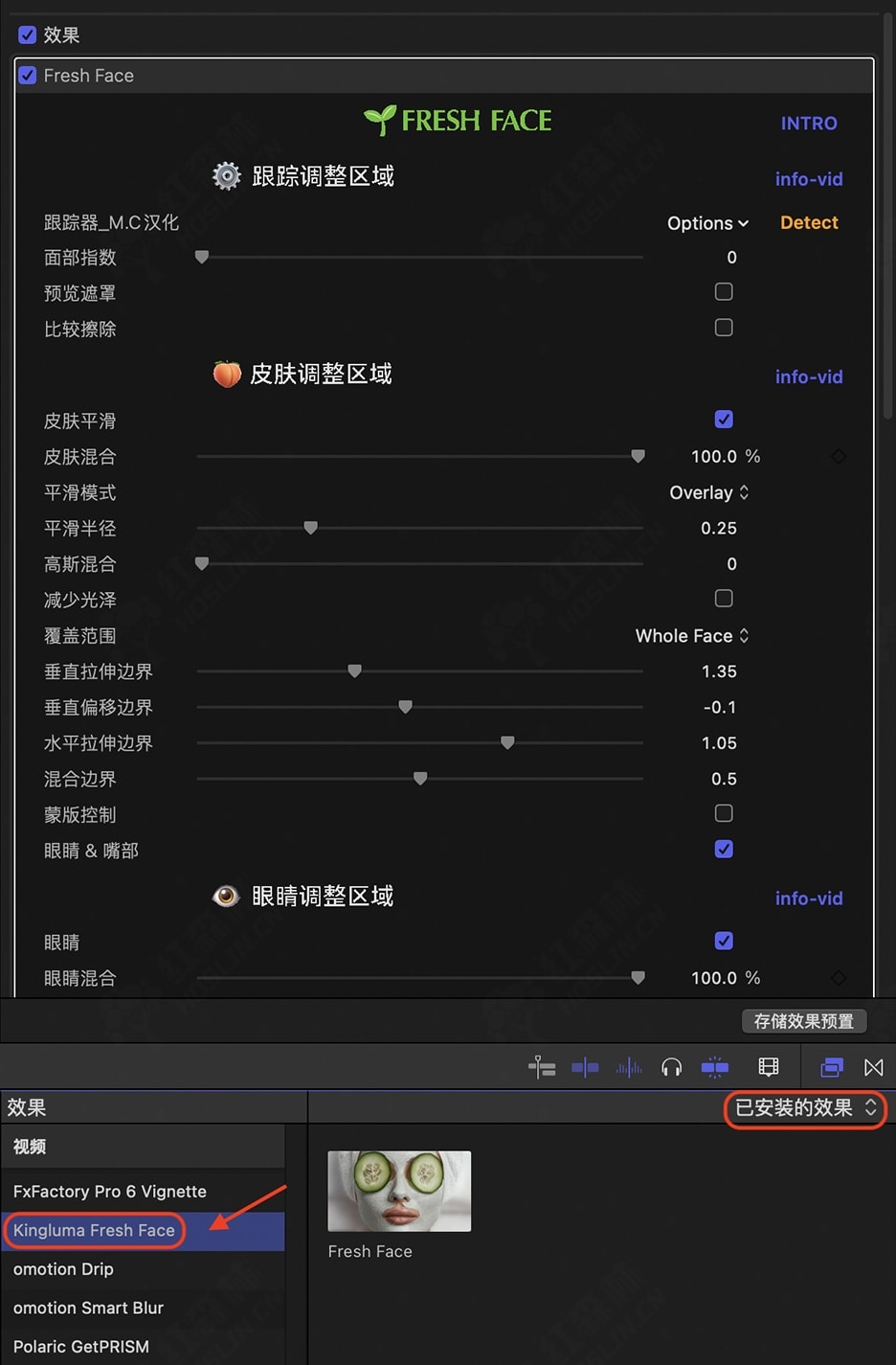 快速为人脸视频添加美颜效果。Fresh Face提供自然的皮肤平滑效果以及精确的眼睛和嘴巴水平调整,可用于近距离或中距离拍摄人脸。它结合了强大的皮肤平滑算法和由最新机器学习面部跟踪驱动的精确蒙版。