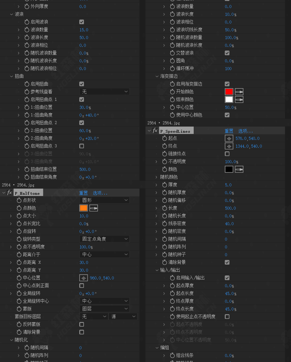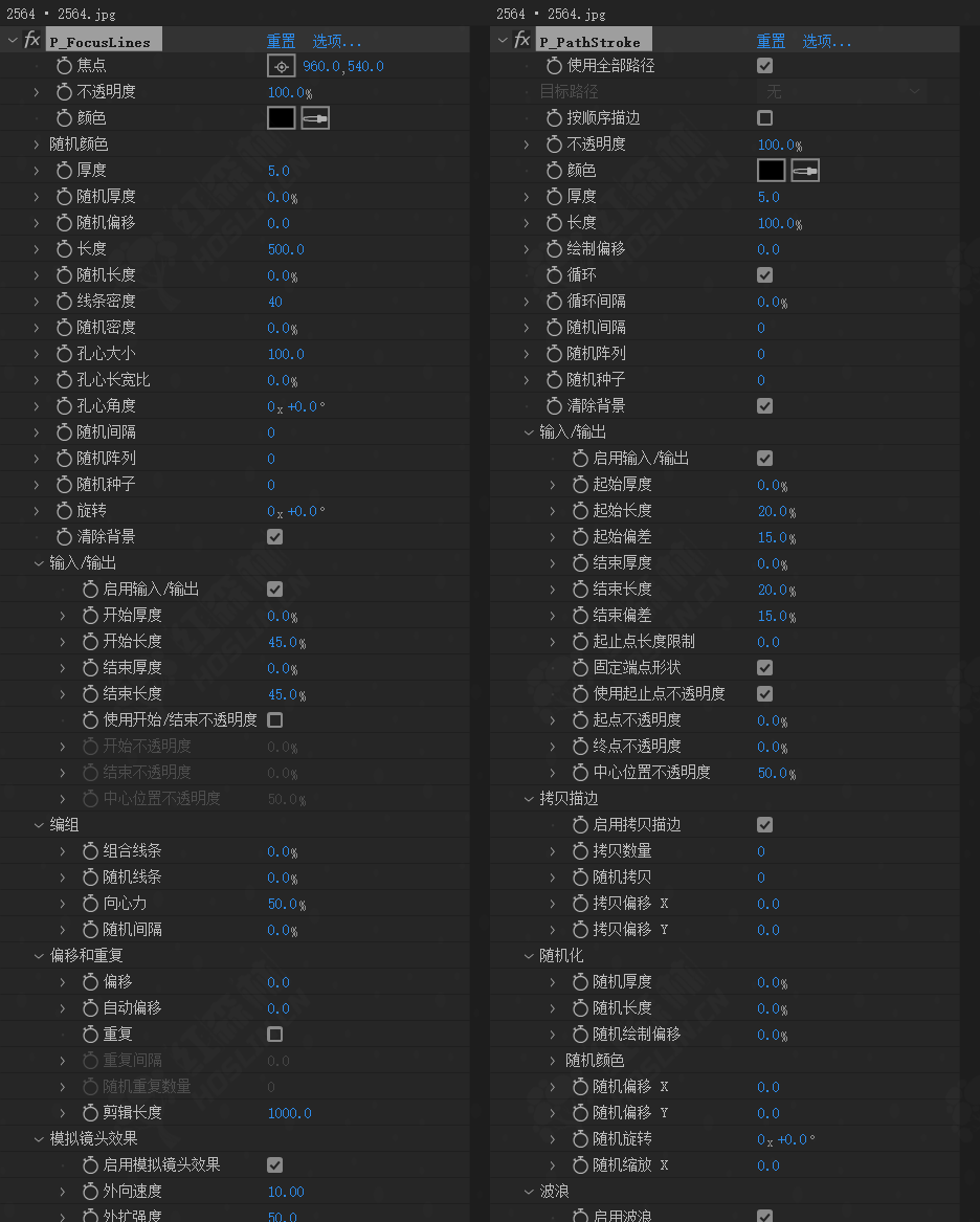 包含4种效果,用来实现漫画里的风格。由于预设能够满足平常需要,操作起来非常简单。卡通中使用的各种效果可以快速,轻松地再现,具有表现力和质量,是制作动画和动画的理想选择. 用来制作观众惊呼时投下的集中线以及跟随人物时的速度线,非常实用。(“集中线”“速度线”都属于漫画术语)。包含插件: