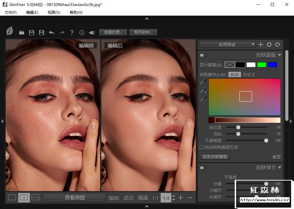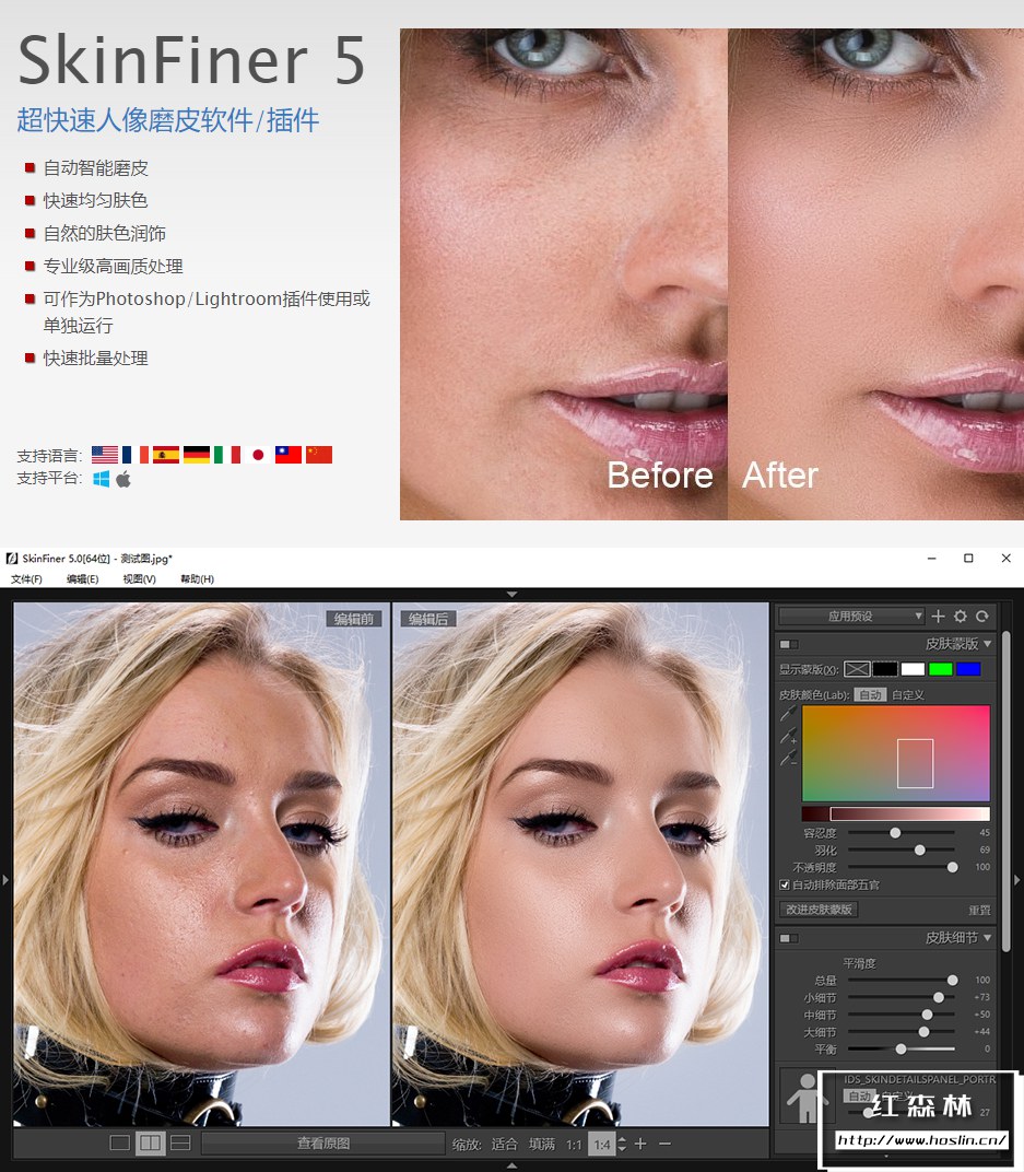 - 配合您的工作流程配合您的工作流程:SkinFiner可以作为Photoshop和Lightroom插件使用,也可以独立运行。您可以根据自己的需求建立专属的效果预设。另外,批处理功能能够帮助您一次性快速编辑多张照片。