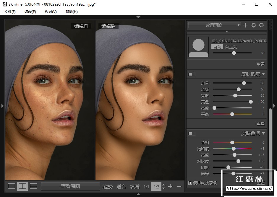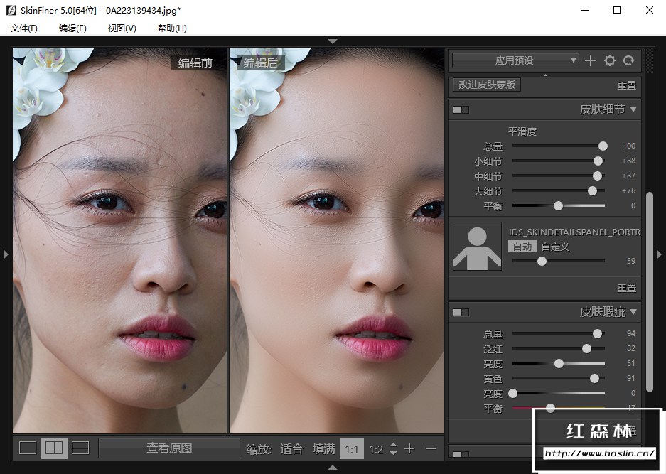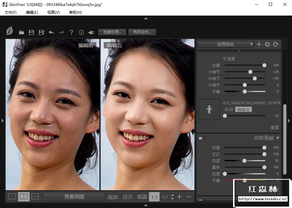 - 均匀肤色:SkinFiner能够自动识别皮肤发红和发黄的区域。仅通过调节滑块您就可以快捷地修正脸部潮红,均匀肤色,使皮肤看起来更健康。