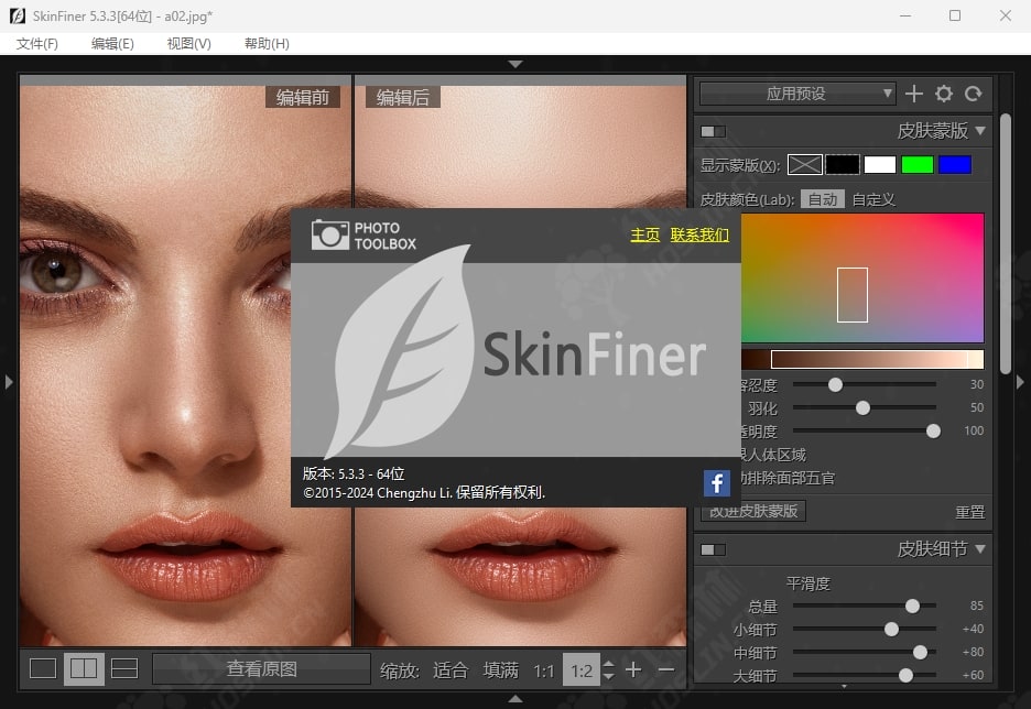 SkinFiner 5 是一款强大的简单好用的人像修饰磨皮软件。该软件提供了专业级的人像照片润饰。用户可以通过简单的照片编辑工具和功能消除斑点来修复皮肤瑕疵。它可以作为独立的应用程序运行,也可以作为Photoshop的插件运行。照片编辑过程将保留图像的纹理和质量,以生成自然的照片肖像。用户可以在社交媒体平台上共享完美的照片肖像,从而比其他人看起来更好。
