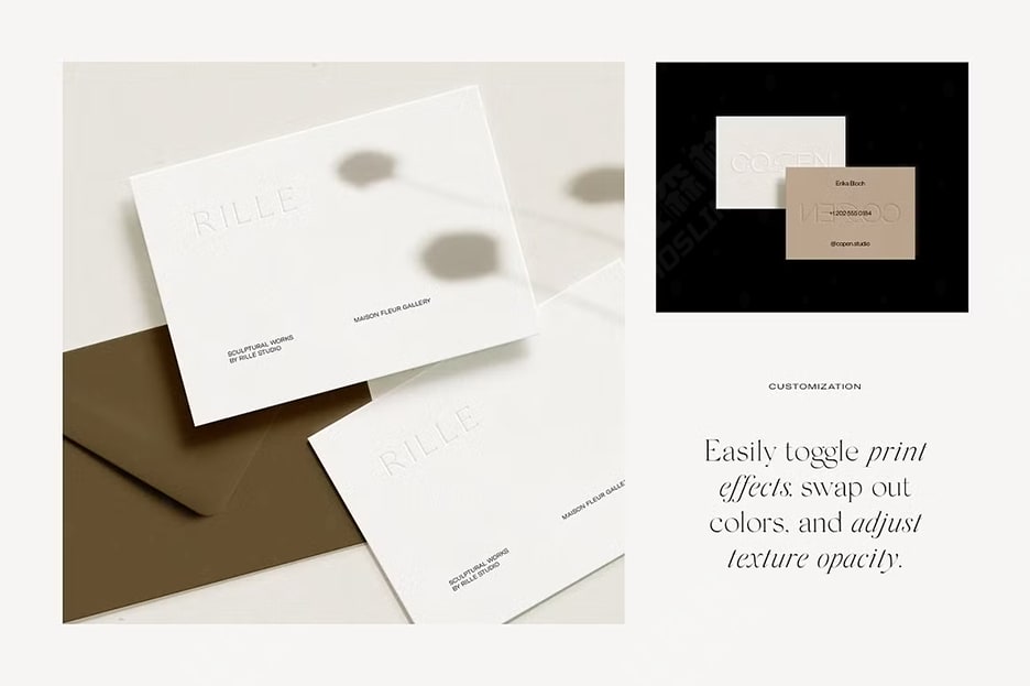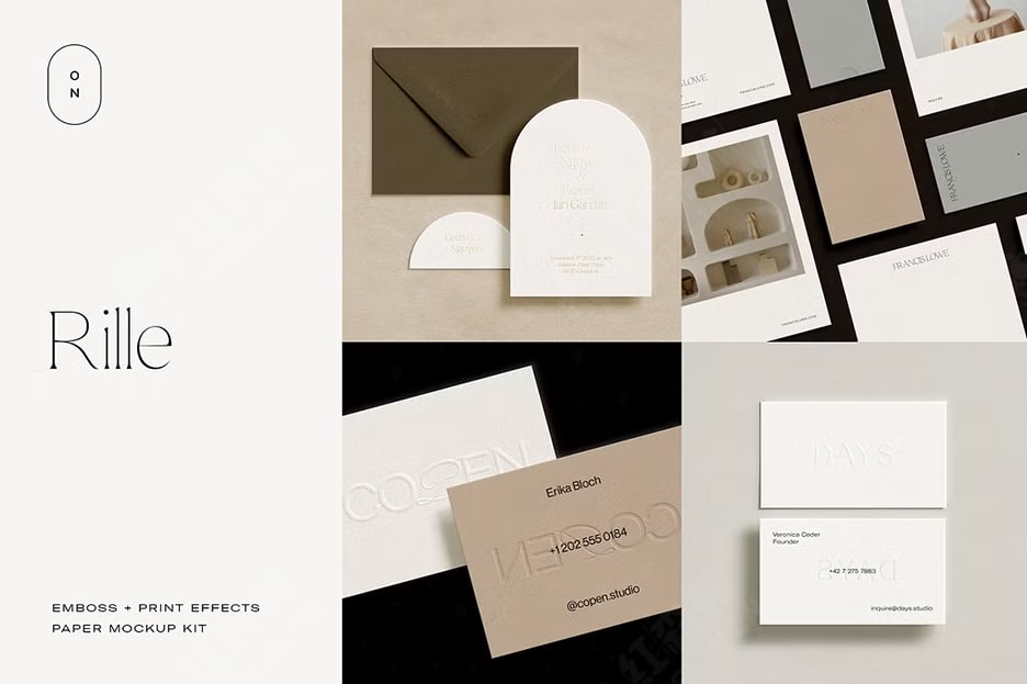 使用 Rille 模型套件,轻松展示具有逼真浮雕、凹陷和金箔印刷效果的品牌项目。通过排列各种随附的纸张尺寸来创建您自己的自定义模型图像,使用智能对象层快速放入您的设计,并从许多不同的印刷效果选项(标准墨水、凹陷、浮雕和金箔)中进行选择,这些选项可以打开/关闭和组合。精心设计的套件包含22 个纸张大小的对象(包括拱形、半拱形和半圆形)、各种植物和阴影叠加层以及15 个预制场景供您开始使用。