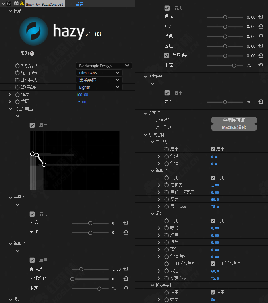 - 可定制的控件:使用 Hazy 的自定义响应控件将您的评分提升到一个新的水平,这些控件决定了效果的衰减。自定义响应图会根据您选择的滤镜样式进行更改,每个点都会适应扩散滤镜的形状。这允许您确定效果最突出的位置,从而获得您想要的外观。