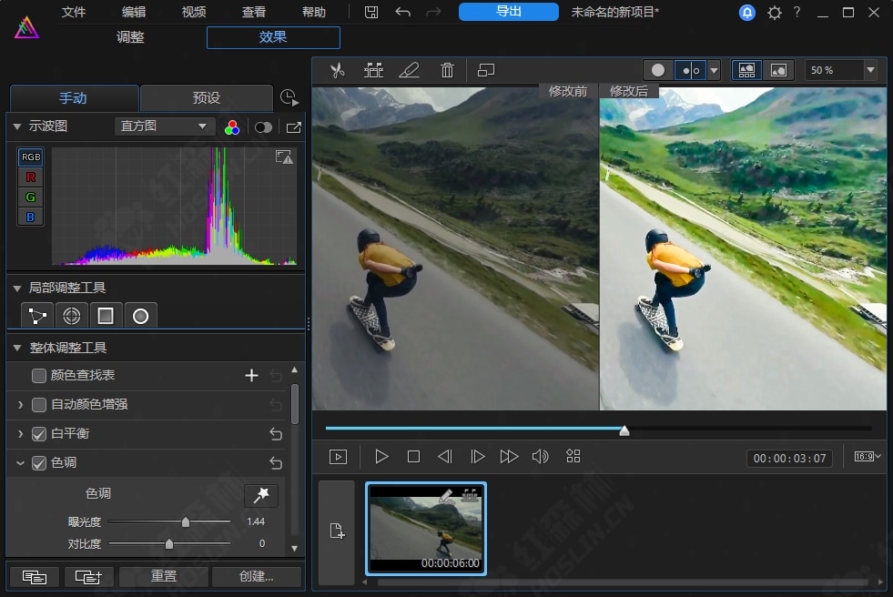 - 分割视频阶调:控制并调整视频中的亮部、中间色调与暗部,为视频提供最专业调色效果!
