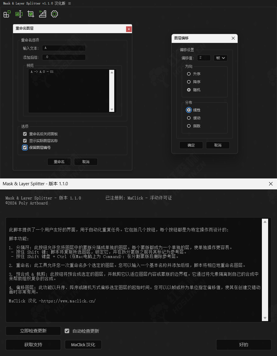 • 偏移图层:按升序、降序或随机顺序偏移选定图层的开始时间,非常适合创建交错动画。