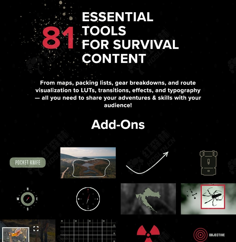 介绍 mSurvival,这是您在任何可怕的编辑情况下的终极救援工具包。编辑更轻松、更快捷,为冒险腾出更多时间!享受超过 80 种顶级工具,68个标题类、5个效果和8个转场。旨在帮助您分享您的经验并让您的观众为他们自己的户外探险做好准备。捕捉大自然的原始之美,传授让您在野外快速移动的技能和知识。从地图、装箱单和指南、装备故障、路线可视化和危险标记到大气的 LUT、叠加效果、方便的背景和充满活力的过渡 – 我们确保您为编辑做好准备,就像为您的探险做好准备一样!
