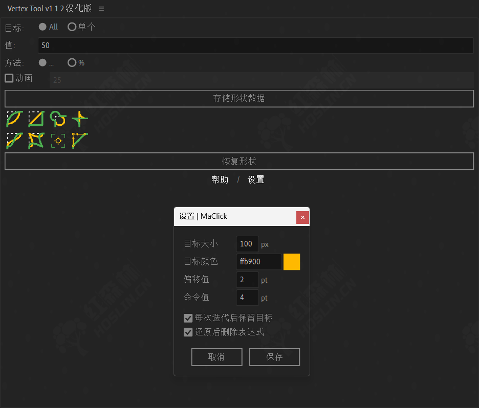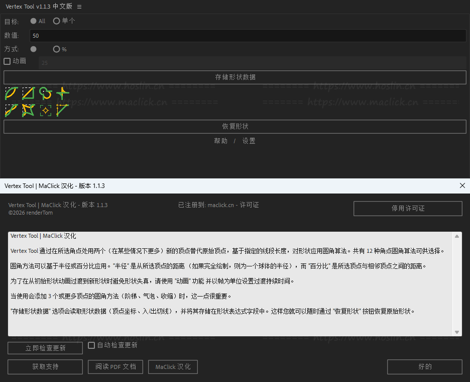 只需单击一下即可将蒙版/形状图层的角圆化!顶点工具根据指定的线长,将两个(在某些情况下更多)新顶点放置在选定角的原始顶点位置,从而将圆角算法应用于形状。有 12 种圆角算法可供选择。为了避免从初始形状动画到新形状时形状变形,请使用动画功能并设置过渡持续时间(以帧为单位)。当使用添加 3 个或更多顶点(步进、气泡、收缩)的舍入方法时,这一点很重要。存储形状数据选项读取形状数据(顶点坐标、入/出切线)并将其存储在形状表达式字段中。这样,您就可以随时使用恢复形状按钮恢复原始形状。
