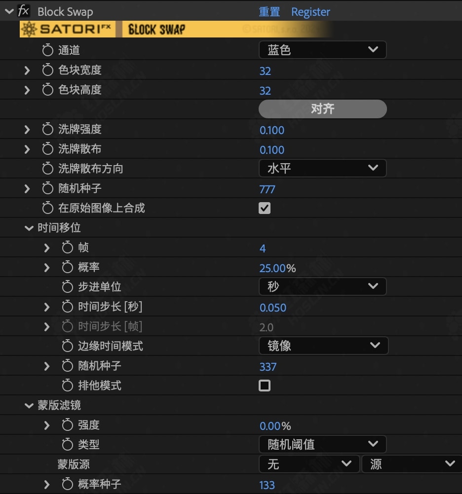 工作原理:源图像的块只是简单地相互交换。它们的大小、分布、数量和其他参数都可以控制和动画化。部分时间偏移允许您及时更改块,而不仅仅是在屏幕空间上。如果发生块交换,可以在蒙版滤镜部分中进行控制,并可以选择一些可能的条件 – 有助于为效果的输入/输出制作动画或精确控制位置。默认值向后兼容以前的版本 1.0。