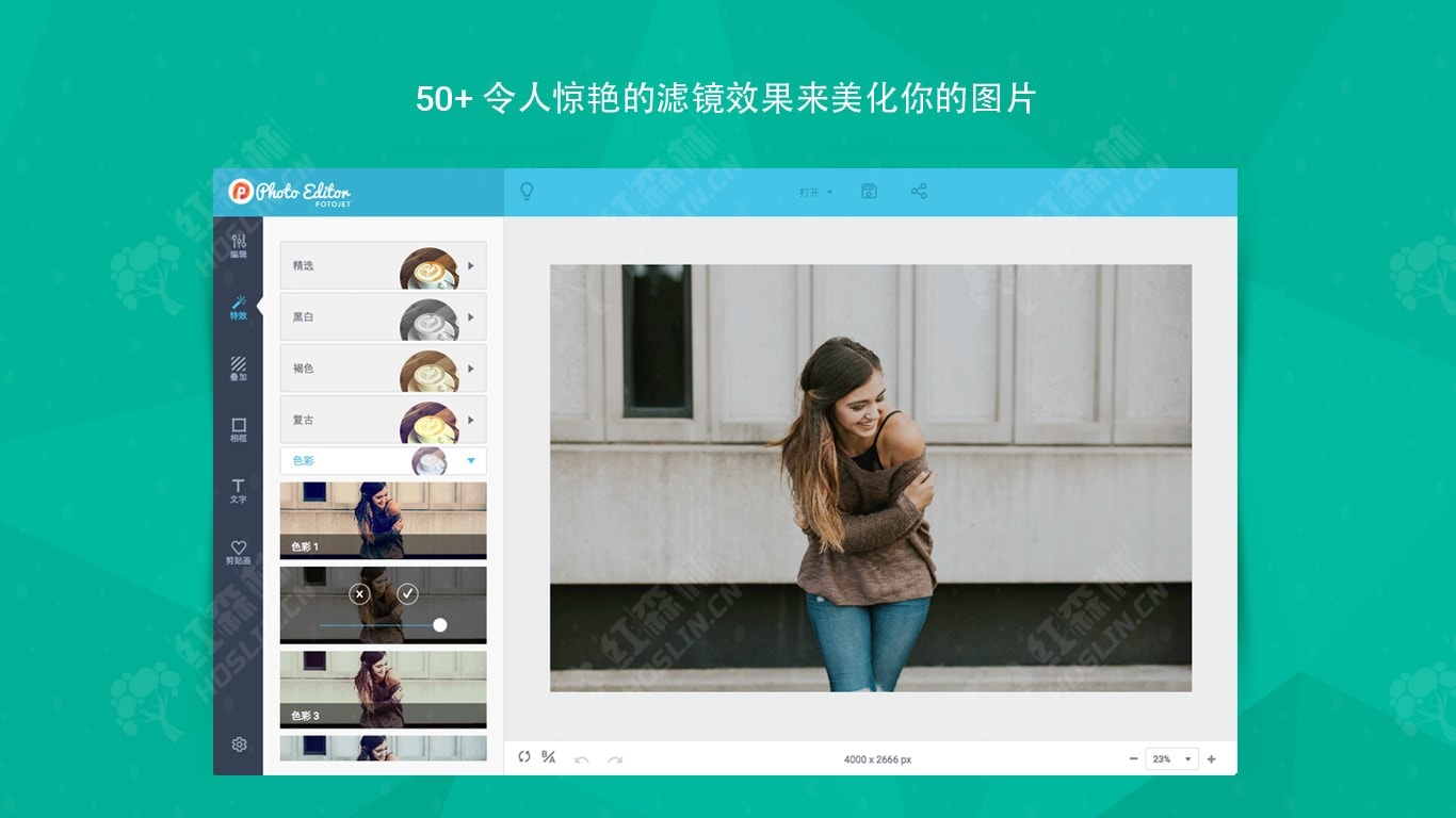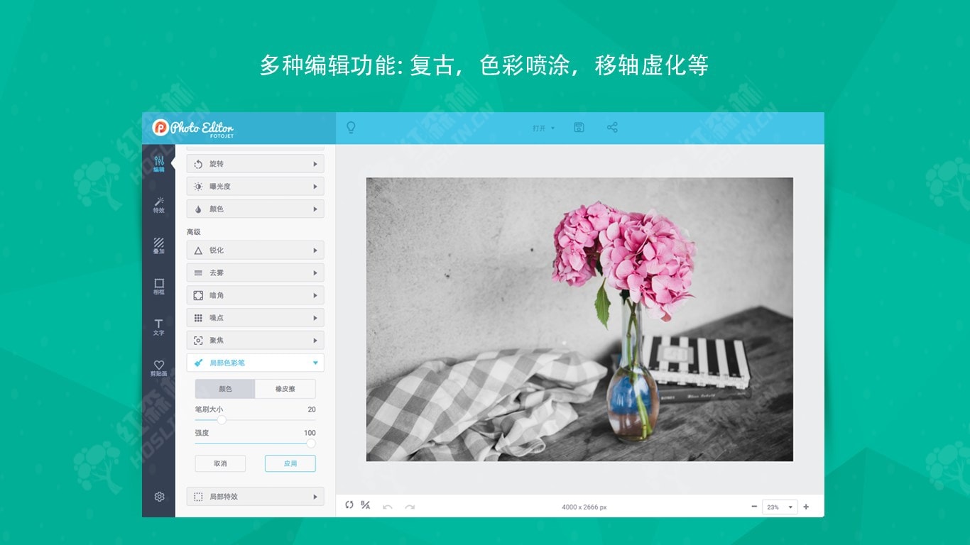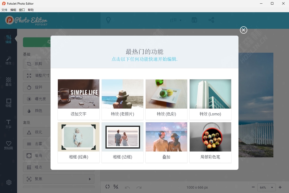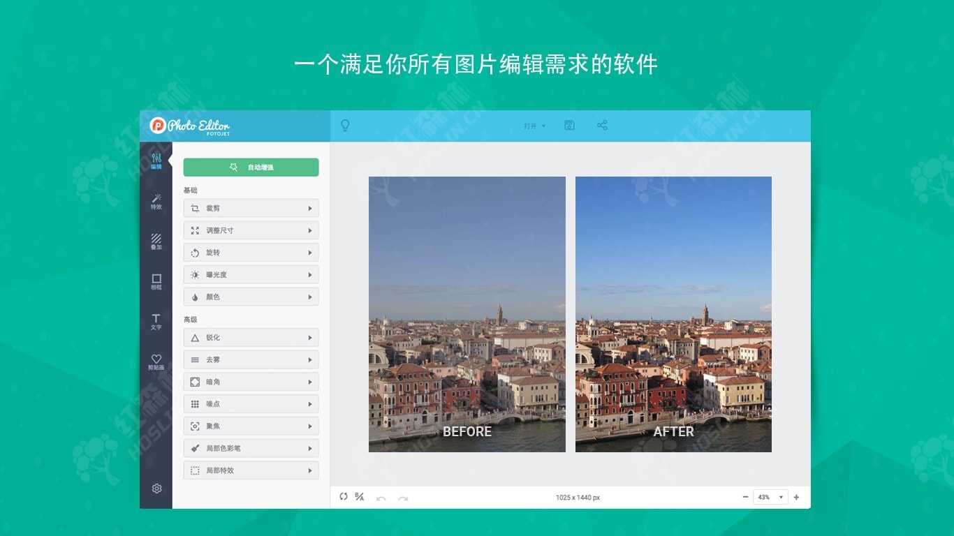 FotoJet Photo Editor 让每个人都能立刻成为图片编辑达人。你不仅可以轻松地编辑图片、使用各种照片特效,还能添加叠加效果、相框、文字、剪贴画等来达到美化照片的目的。无论你是设计小白,还是经验丰富的设计师, FotoJet Photo Editor都可以满足你所有的编辑需求。只需使用这些便捷的编辑工具,轻点几下鼠标,你会发现,你的图片就会让人眼前一亮。