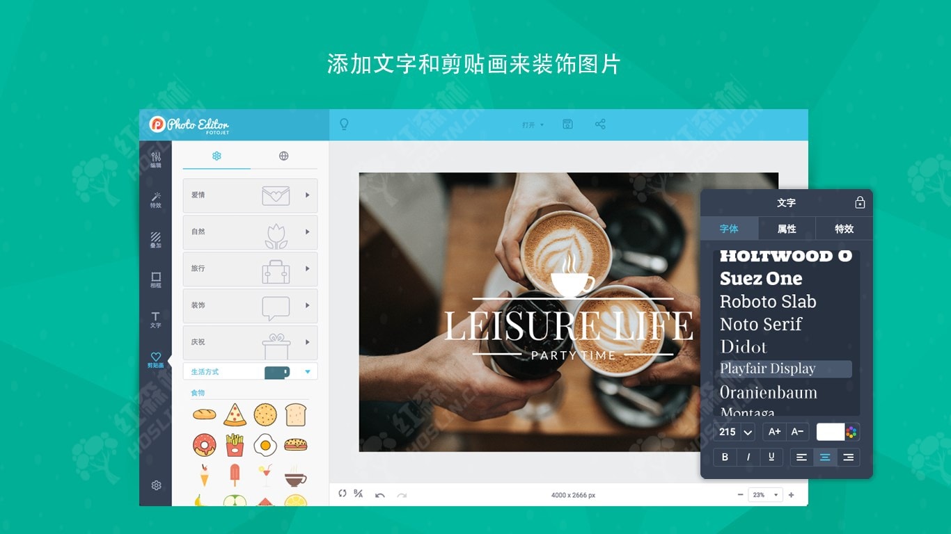 - 任意调整文字的透明度、字体、颜色、大小、对齐方式和文字效果
