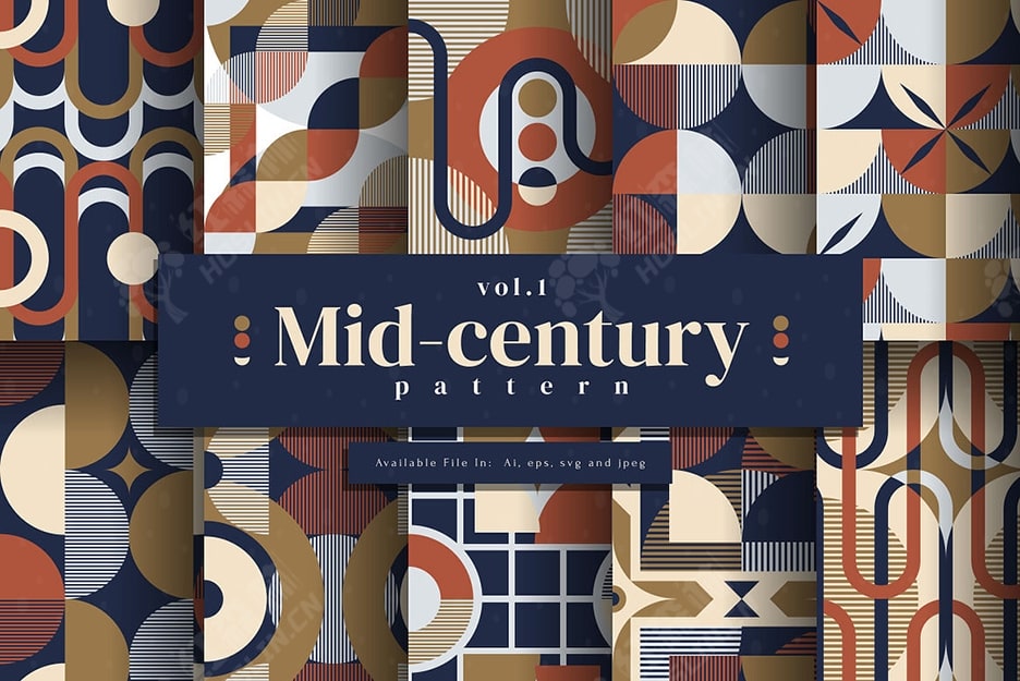Mid Century Pattern Vol.1 是一款包含多种中世纪风格图案的设计素材包,适用于海报、包装、网站和品牌设计。每个图案都具有独特的复古美学,灵感来源于20世纪50年代和60年代的设计风格,非常适合创作具有怀旧感的现代设计。高品质图案概念适合商业和个人需求。