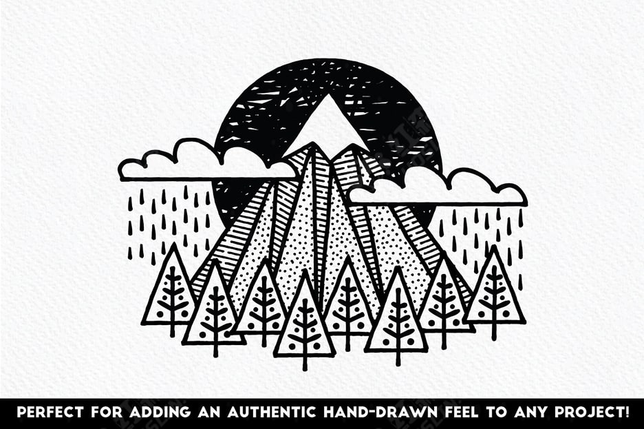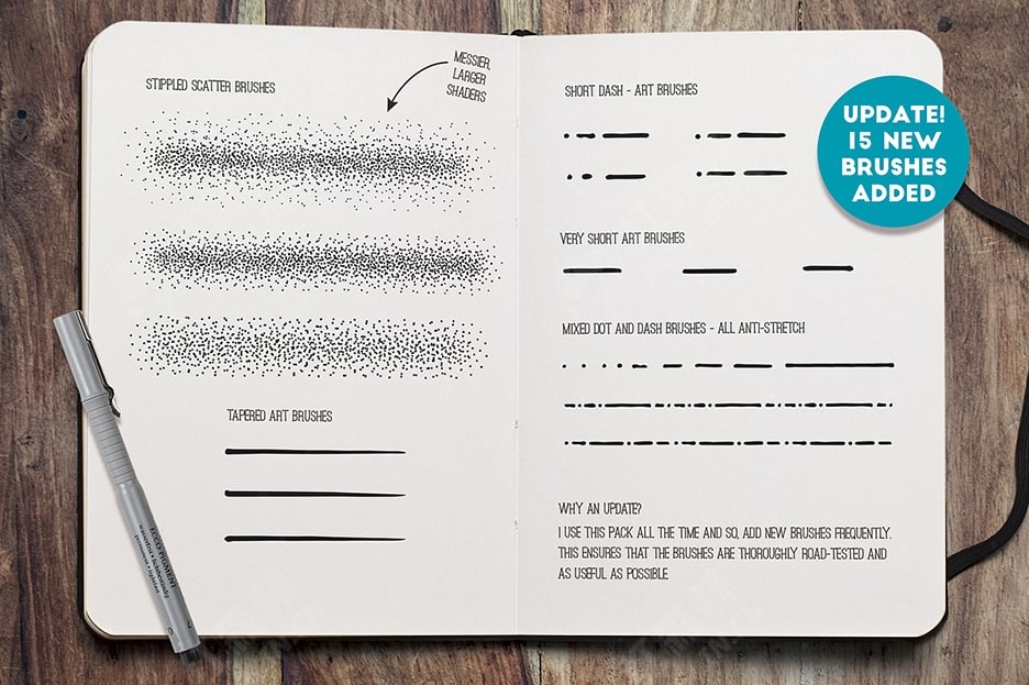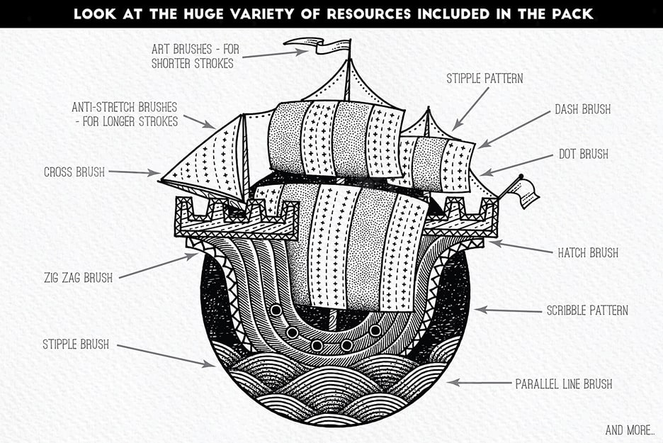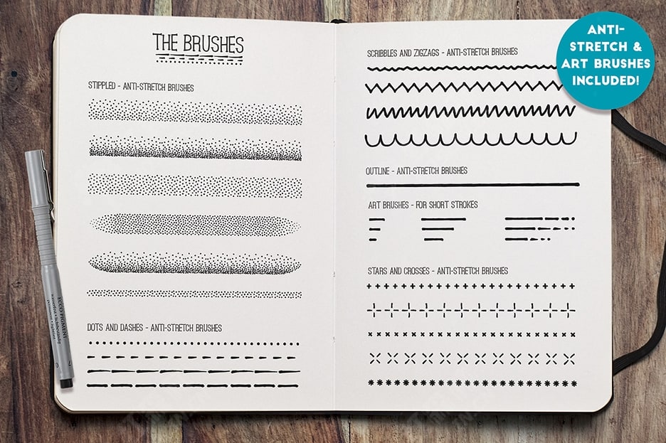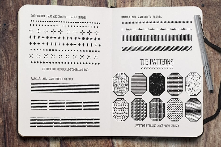 我在回忆往事,整理旧学校和艺术学院的素描本后,开发了这个套装,在那里我重新发现了对细线笔的热爱。我过去花在制作图案、形状和涂鸦上的时间可能比我应该花的时间要多。这款真实而多功能的工具包包含大量不同的笔迹 -直线和粗略轮廓、点和破折号、点画、阴影线、锯齿线等等。我还提供了一系列细线纹理 – 使用这些纹理可以快速填充区域。