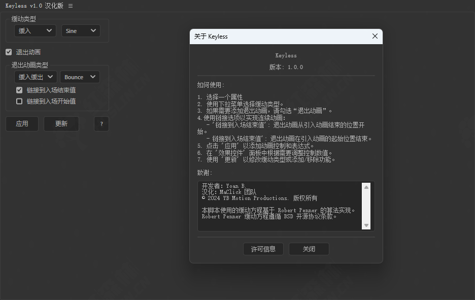 Keyless 允许运动设计师在 After Effects 中为任何属性设置动画,无需关键帧。使编辑者能够完全控制关键动画选项,例如:开始 / 结束值,开始 / 结束时间等,同时保持您喜欢的创作方式。它非常适合 MOGRT 创建,对于那些不熟悉 linear() 函数的人来说,它会自动应用 Penner 缓和和正确的控件,为更流畅的动画提供简单、灵活的解决方案。
