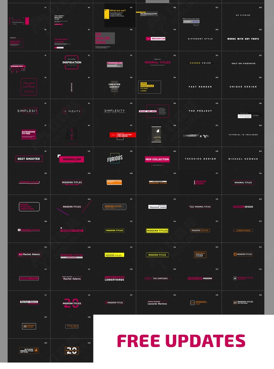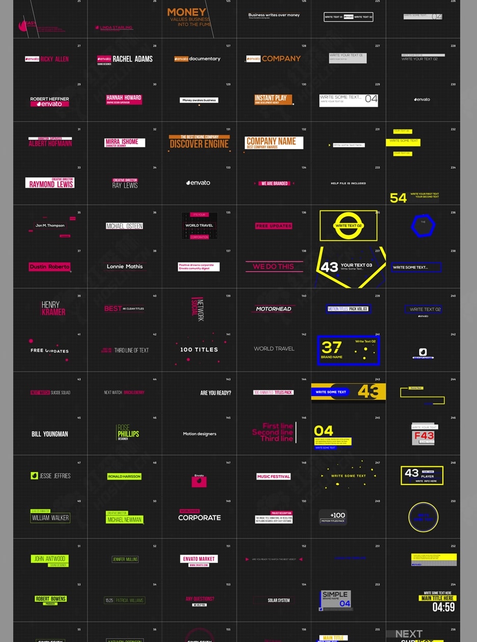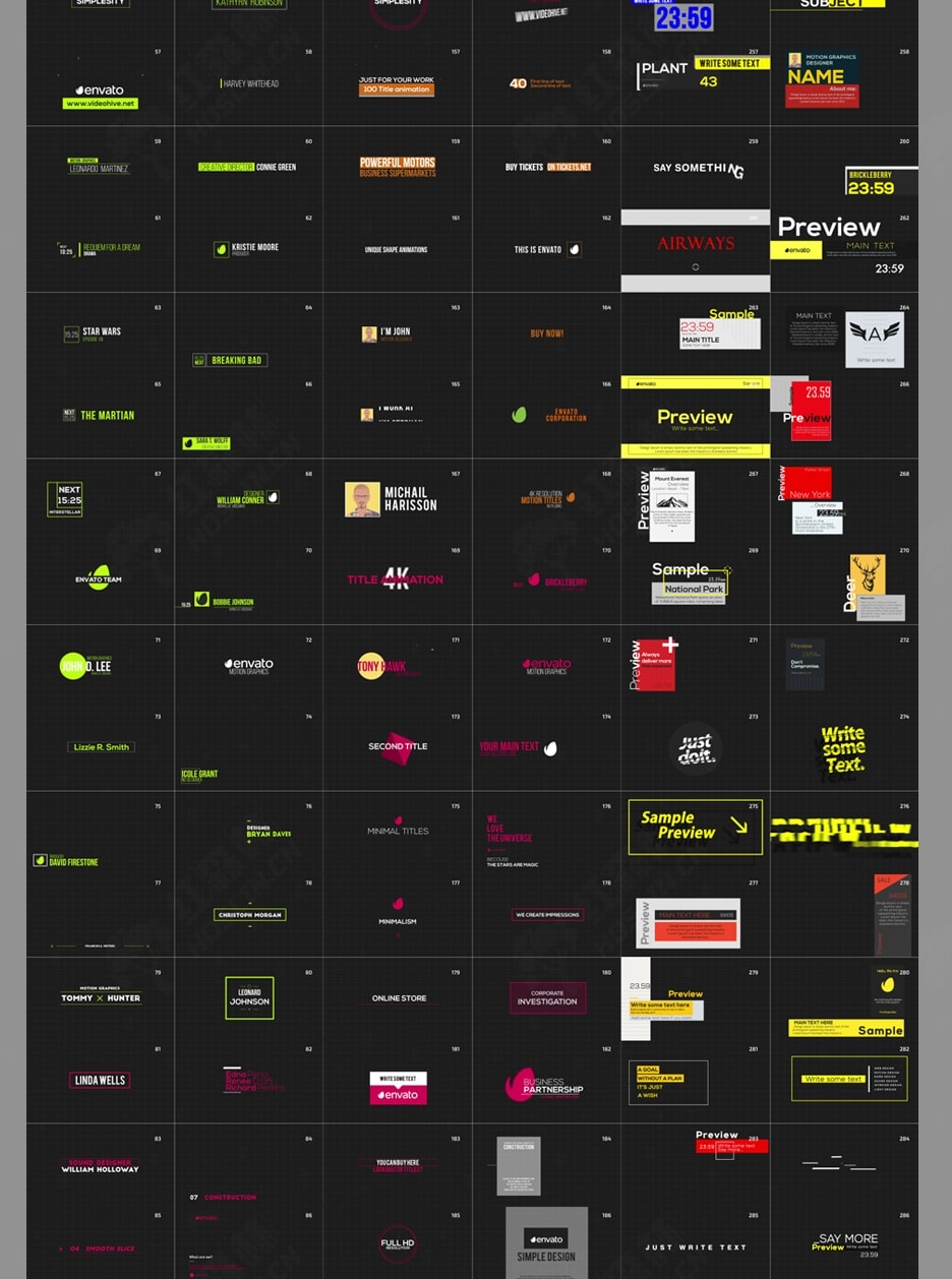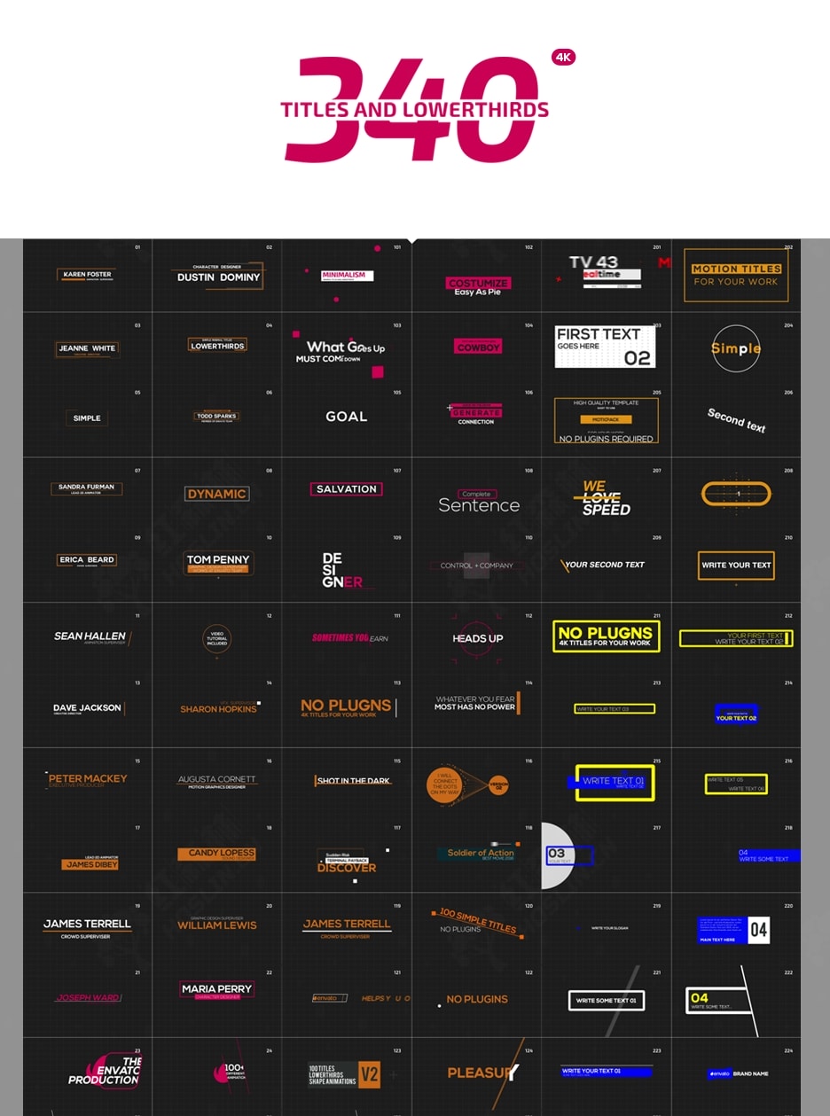 该项目包括 340 个适用于 Adob​​e After Effects 的动态图形标题文字和字幕条动画。种现代简洁风格的动画设计,适合用于视频开场、信息展示或社交媒体内容。无需任何插件或脚本,非常容易定制,操作简单,支持自定义文本与颜色,标题可以使用预告片、预告片、宣传片或任何类型的视频。