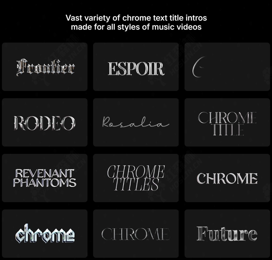 40 种不同风格的彩色字幕和文字动画,每种模板包含 10 种样式,每种样式包含 4 种动画。所有文字元素均可根据您的视频风格进行修改和自定义。Chrome Titles 是打造风格化音乐视频的理想之选。