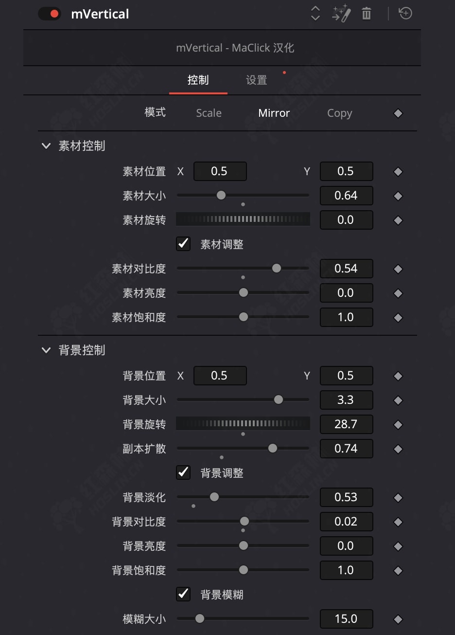 一款简单而实用的达芬奇插件,可以给竖版视频快速添加背景效果,能够选择背景模式:大小,镜像,复制;可控制位置,大小,旋转,透明度,饱和度,明度,模糊,以及覆盖颜色。它帮助用户将竖屏素材无缝融入横屏项目中,常用于社交媒体内容的制作。插件使用简单,包含视频教程。