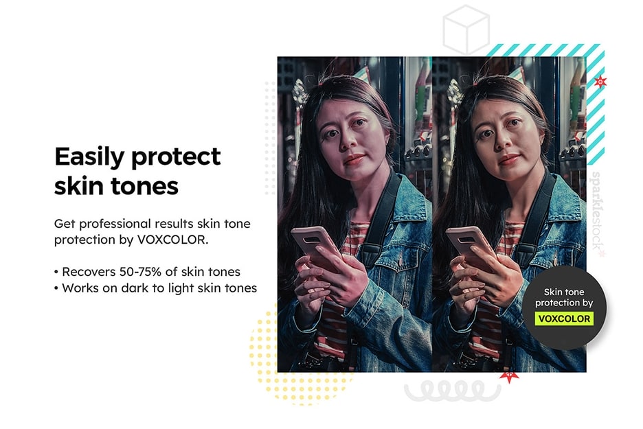 - ✔️ 使用 VOXCOLOR SmoothTones 和 Skin Tone Protection 增强以获得专业效果。
