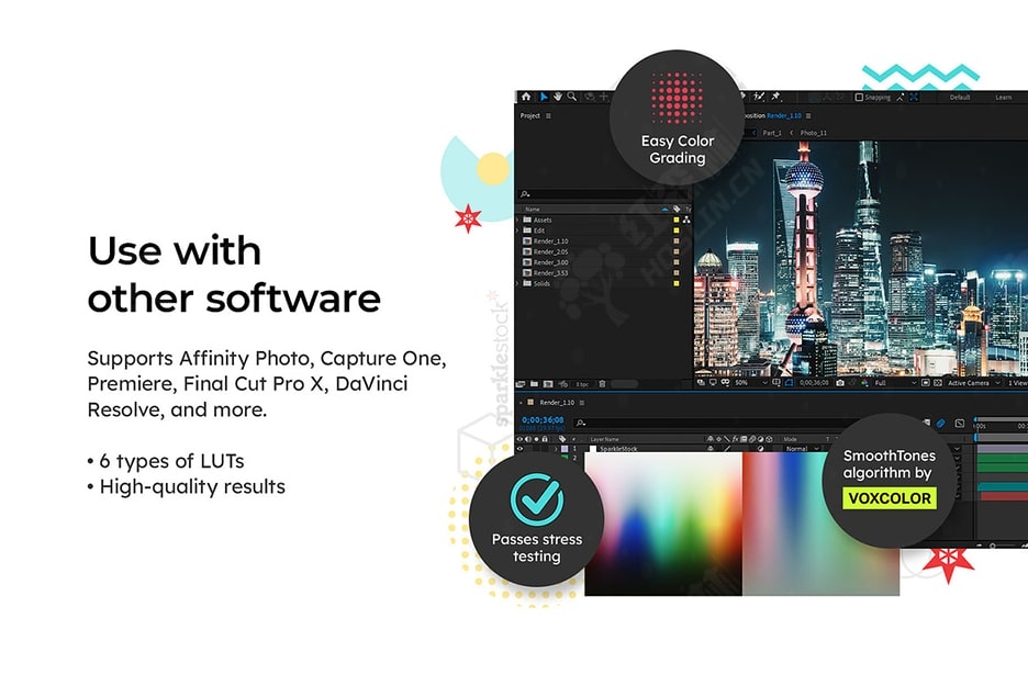 - Premiere Pro、After Effects、Final Cut Pro X、DaVinci Resolve、OBS Studio、Spark AR Studio 等的 LUT(3dl、cube、look、png 和 mga)