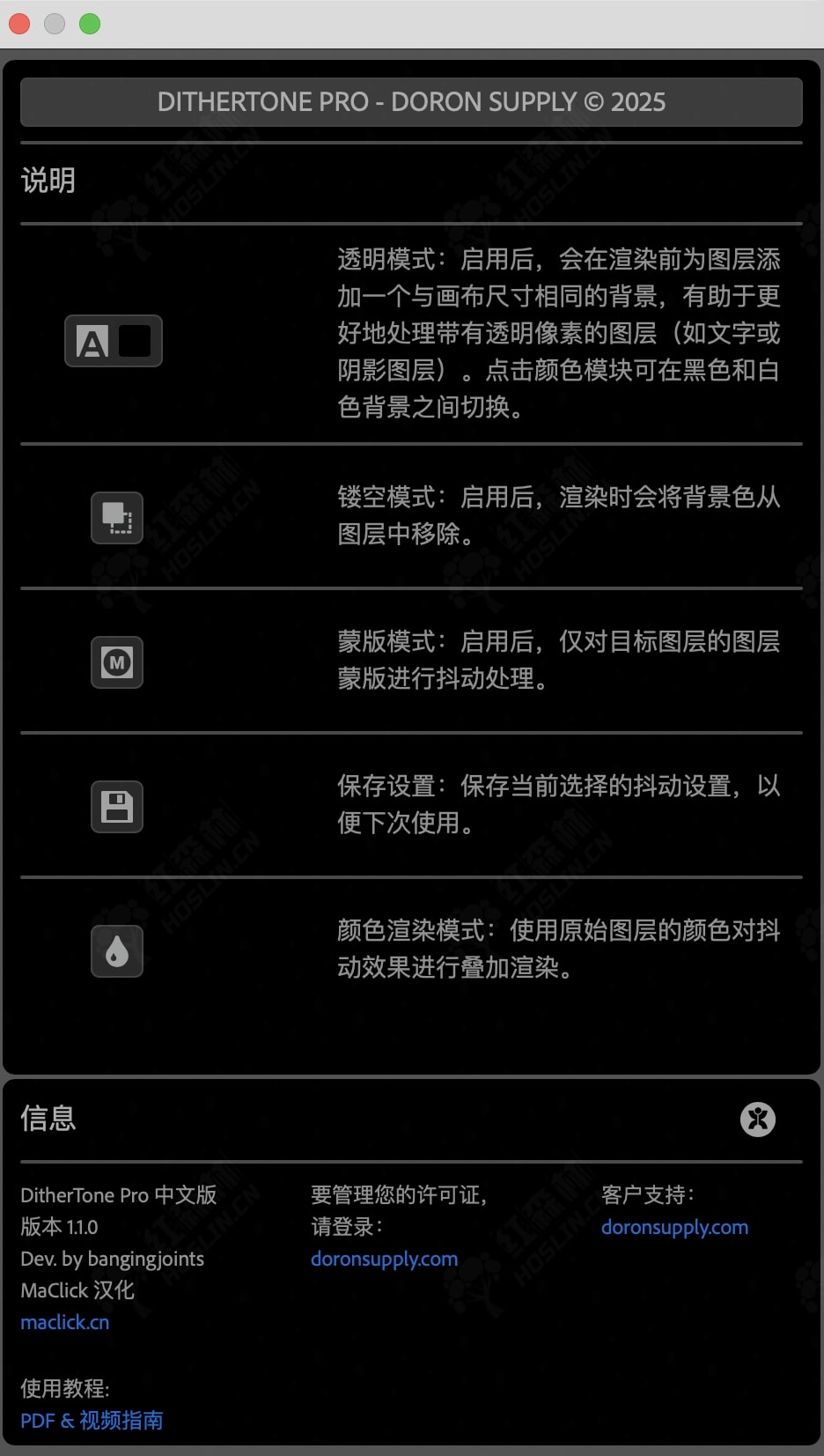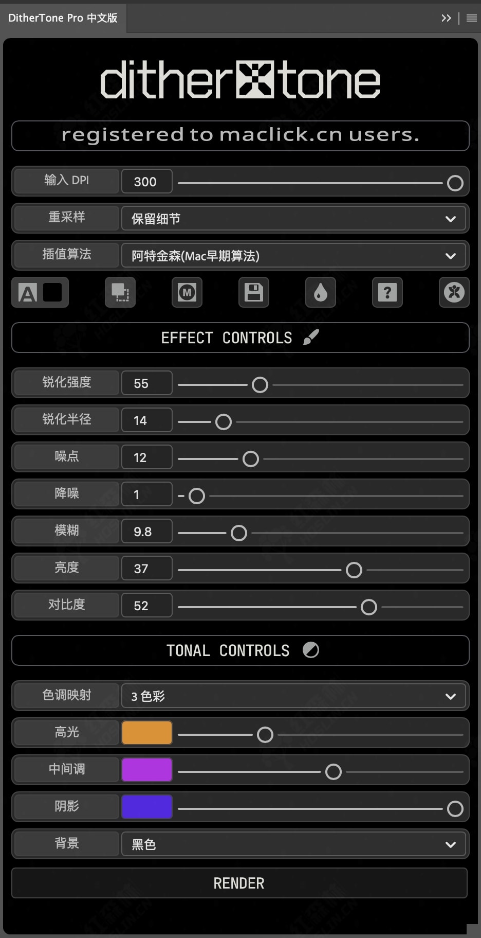 • 色调颜色映射:使用精确的三色调映射,实时渲染,提升您的设计水平。您可以对作品的阴影、中间色调和高光进行分别抖动和着色。