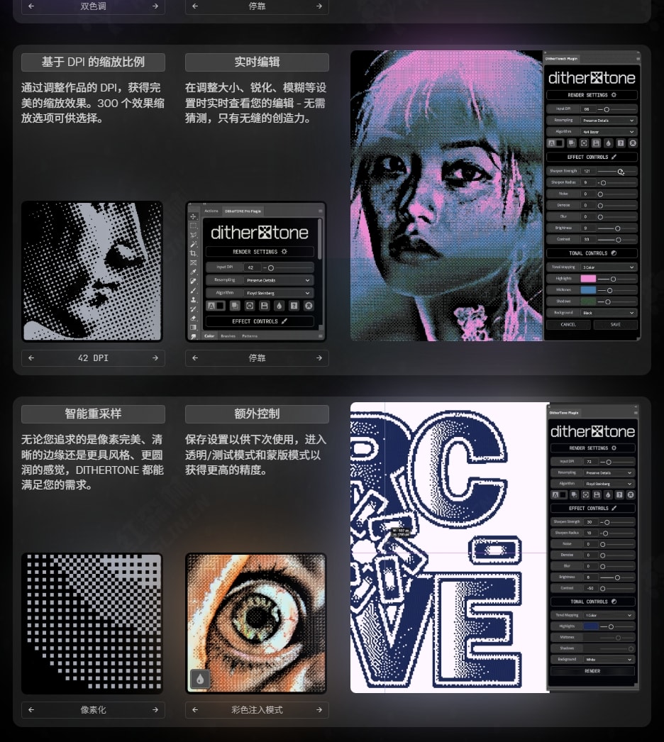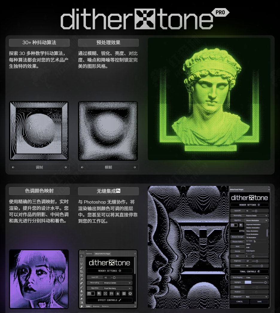 抖动效果是让设计焕然一新的可靠方法。但在 Photoshop 中实现它总是感觉比实际操作要难得多,直到现在。在 Photoshop 中,制作位图需要点击 14 次。使用 DitherTone Pro,一次即可完成。在这款新插件中您可以访问 Photoshop 中没有的 30 多种独特的位图算法,实时自定义效果,并尝试双色调和三色调色彩效果。适合设计师快速创作复古或像素风图案,兼顾效率与精度,值得您的尝试!