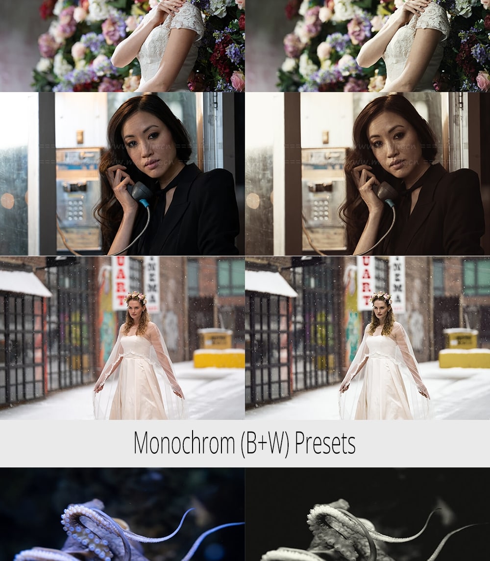 - Monochrom (B+W) Presets:黑白图像可以追溯到摄影史上最早的例子。有趣的是,黑白绝非仅仅是黑白。Monochrom 预设将黑白色调的对比与微妙的色调相结合,重现黑白摄影的经典外观。