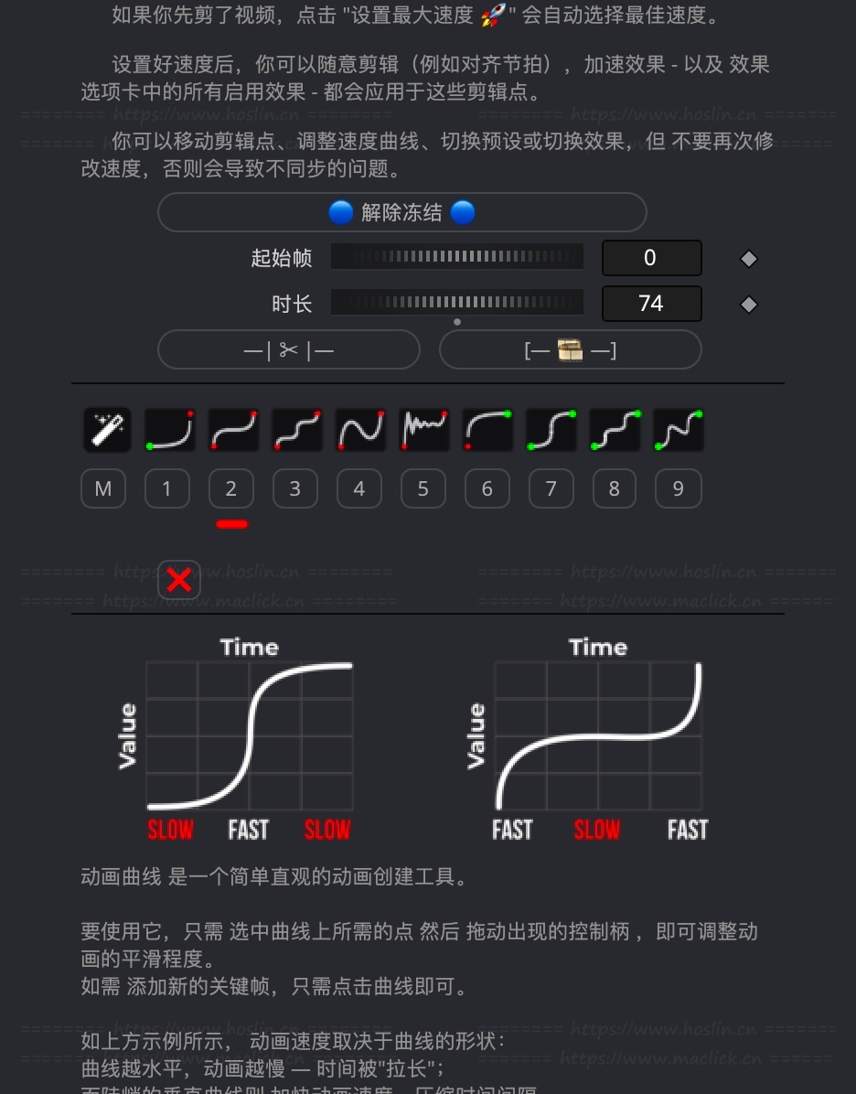 - 9 种预设曲线和手动模式 – 使用专业设计的速度曲线,或创建您自己的自定义时序。视觉指示器可帮助您顺畅地切换过渡。