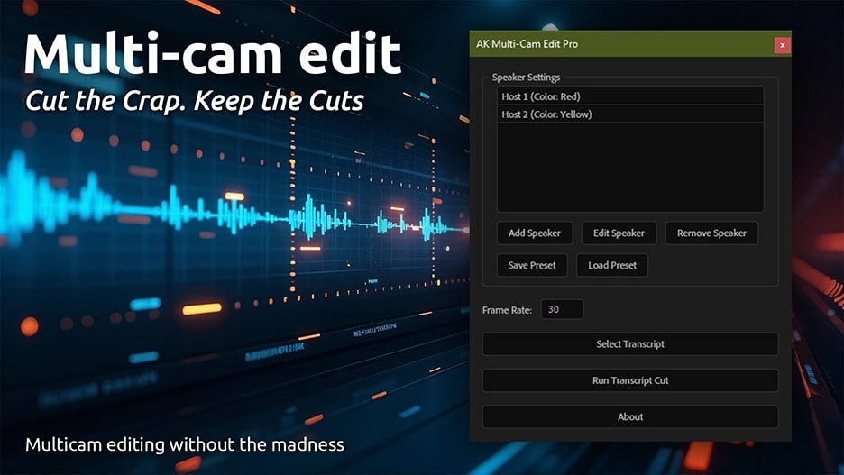 Multi-Cam Edit 使用从 Premiere Pro 导出的文字记录(保存为文本文件)在 After Effects 中自动进行多机位剪辑。根据文字记录中的时间码和发言人姓名,Multi-Cam Edit 会自动剪切 After Effects 中相应的视频图层,让您快速重建多机位剪辑。